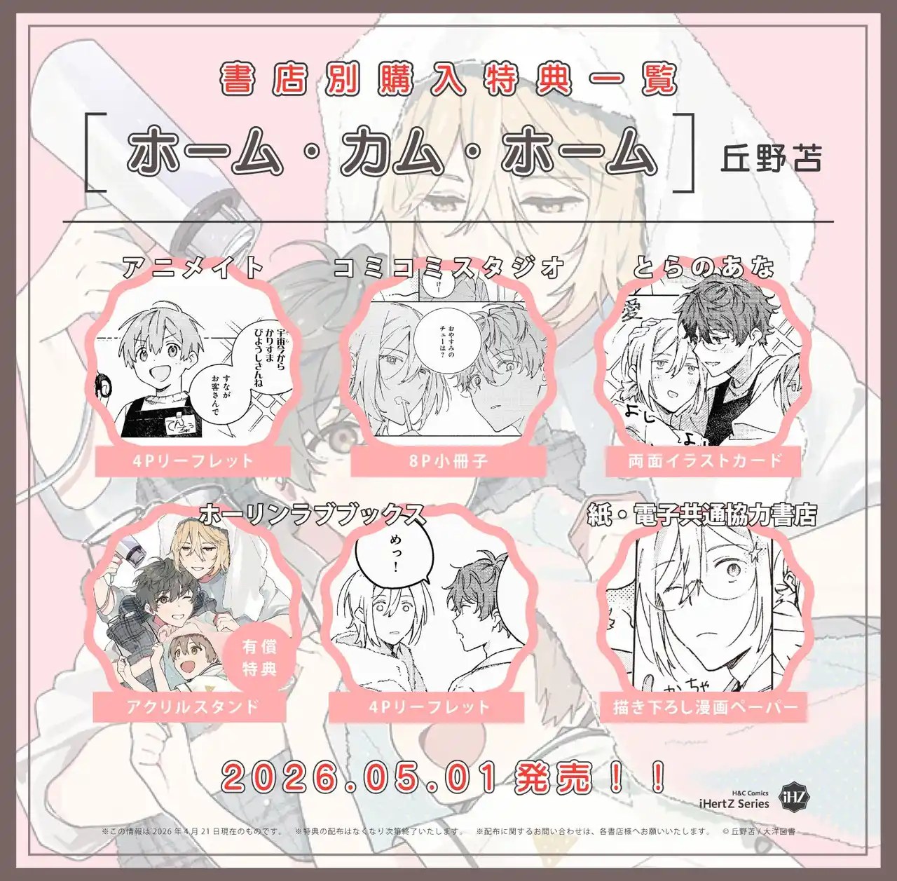 | 「ホーム・カム・ホーム」全5話/単行本収録描き下ろし漫画3P/協力書店様共通特典漫画ペーパー 1P | |||