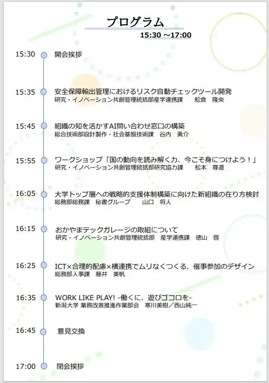 主に事務職員、技術職員の方 【プログラム】 15:30 - 15:35 開会あいさつ 15:35 - 15:45 安全保障輸出管理におけるリスク自動チェックツール開発 研究・イノベーション共創管理統括部 産学連携課 舩倉 隆央 15:45 - 15:55 組織の知を活かすAI問い合わせ窓口の構築 総合技術部 設計製作・社会基盤技術課 谷内 勇介 15:55 - 16:05 ワークショップ「国の動向を読み解く力、今こそ身につけよう!」 研究・イノベーション共創管理統括部 研究協力課 松本 尊道 16:05 - 16:15 大学トップ層への戦略的支援体制構築に向けた新組織の在り方検討 |