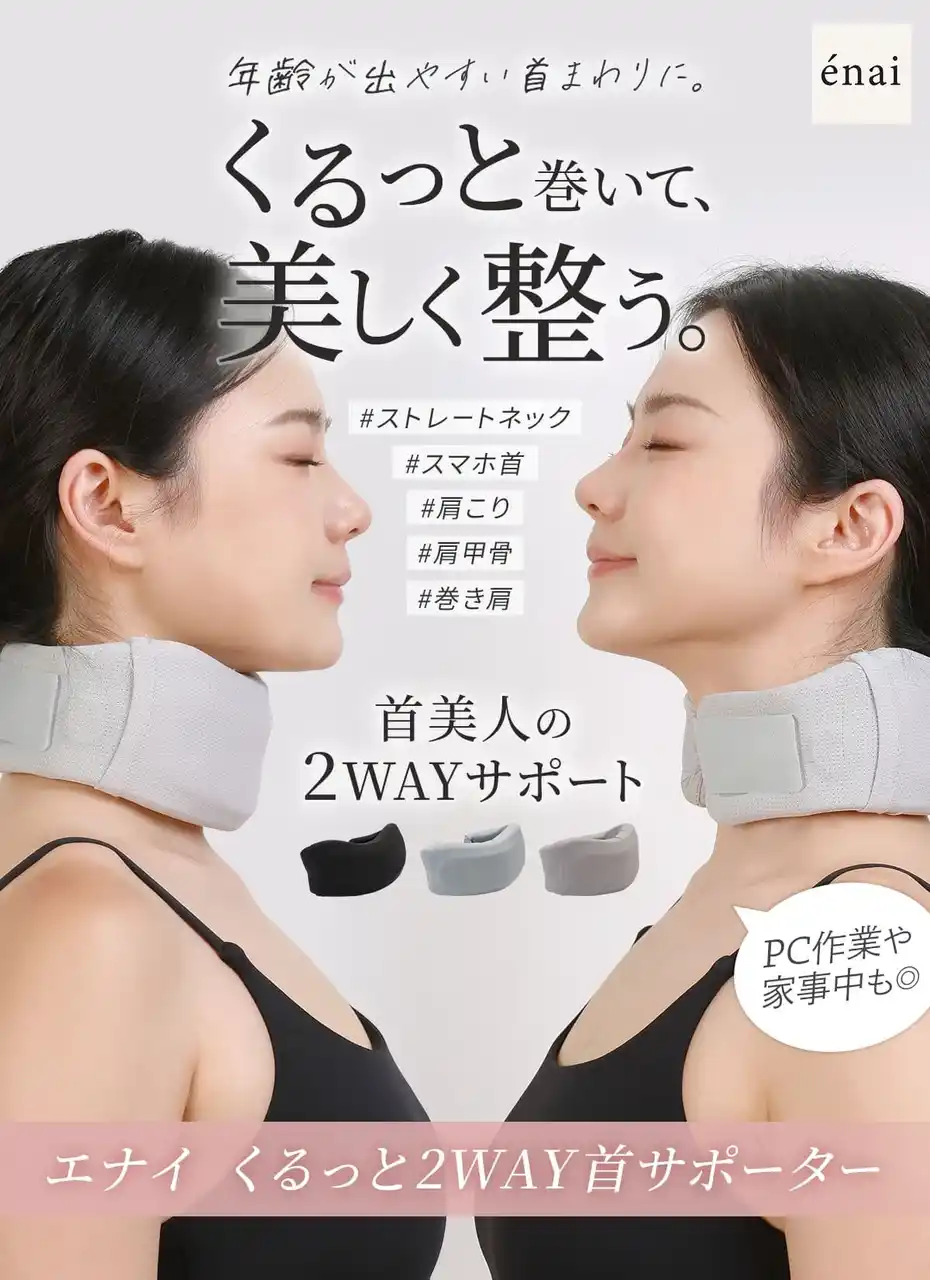 補正下着メーカー発のライフスタイルブランド「エナイ(e’nai)」から、 “現代女性のリアルに寄り添う、『くるっと2WAY首サポーター』が登場します。 |