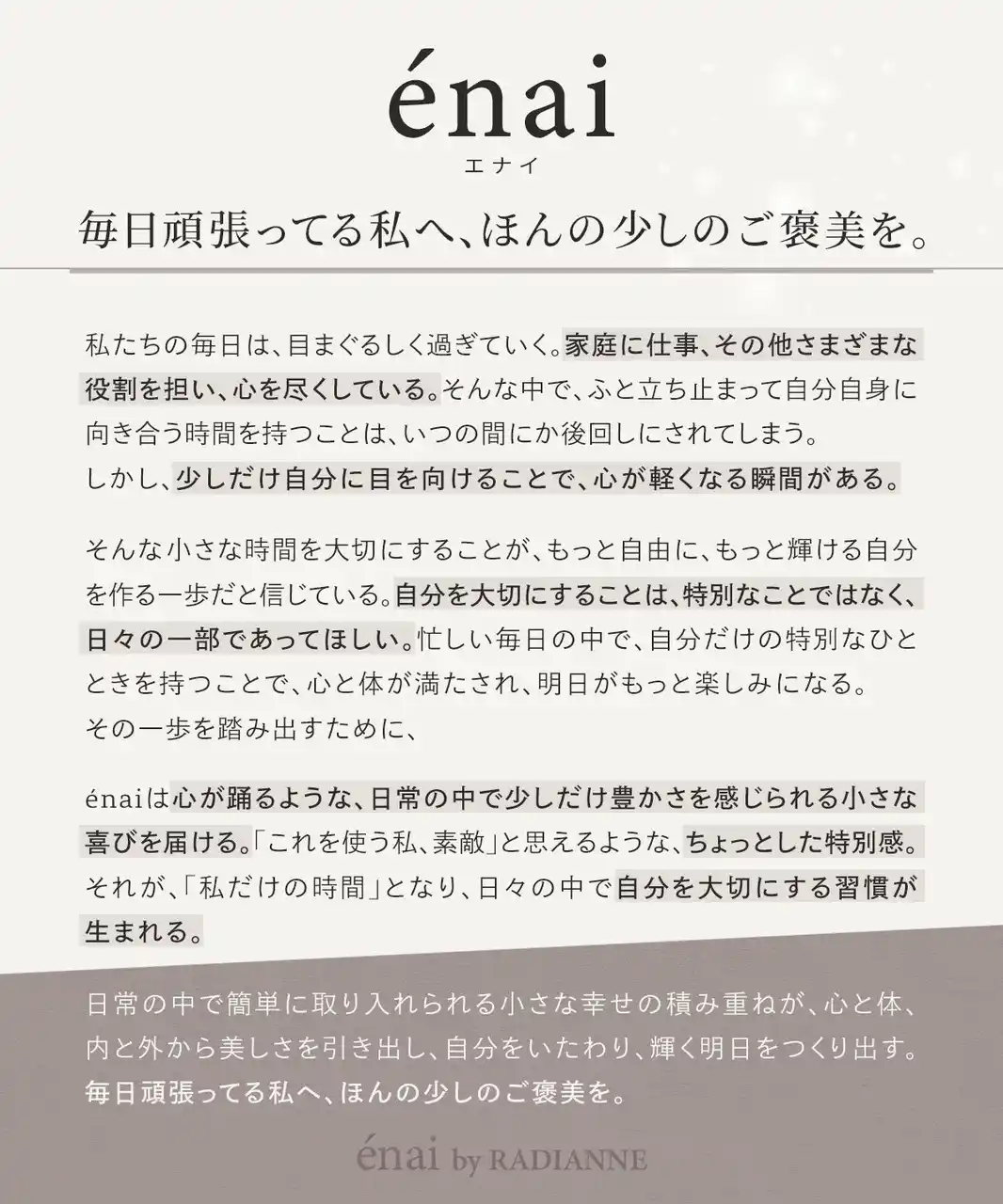 「enai(エナイ)」は、忙しい女性たちが自分らしさを引き出し、日常の中で簡単に取り入れられる美と健康を提供するブランドです。 |