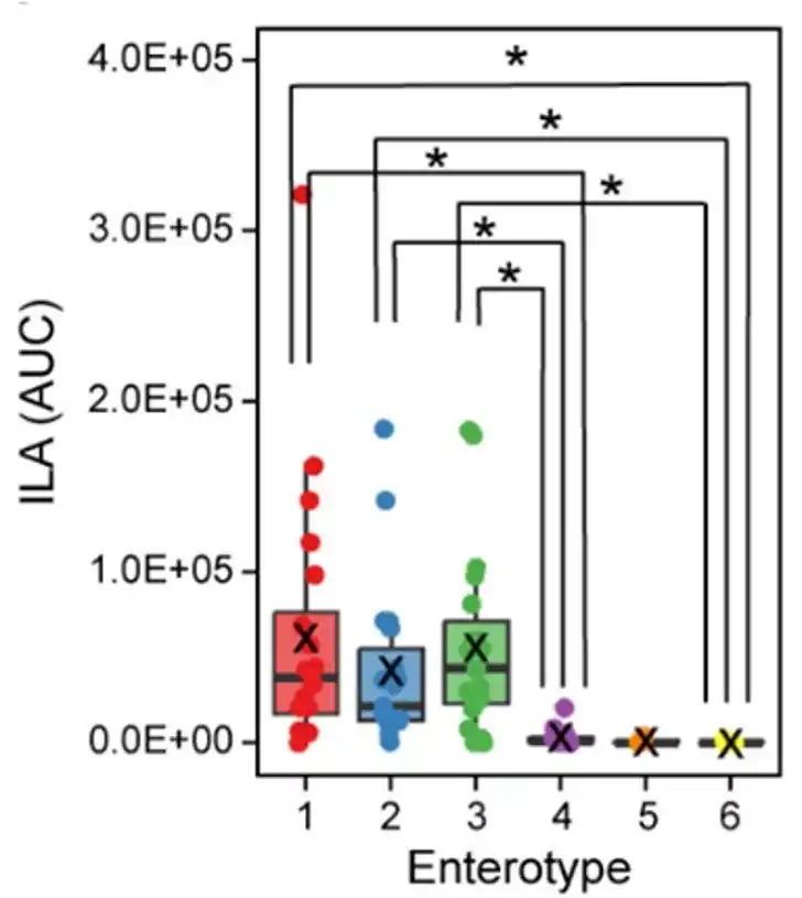 | ・ビフィズス菌M-63摂取群では、ビフィズス菌優勢なタイプ(タイプ1-3)の分布が多く、このグループの腸内では抗炎症作用を有する代謝産物、インドール-3-乳酸(ILA)が増加していました(図3)。 |