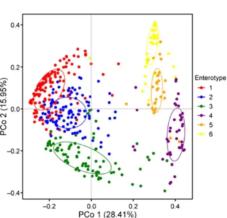 | 図2:腸内細菌叢の分類(1-3:ビフィズス菌優勢な菌叢、4-6:ビフィズス菌非優勢な菌叢) |  |