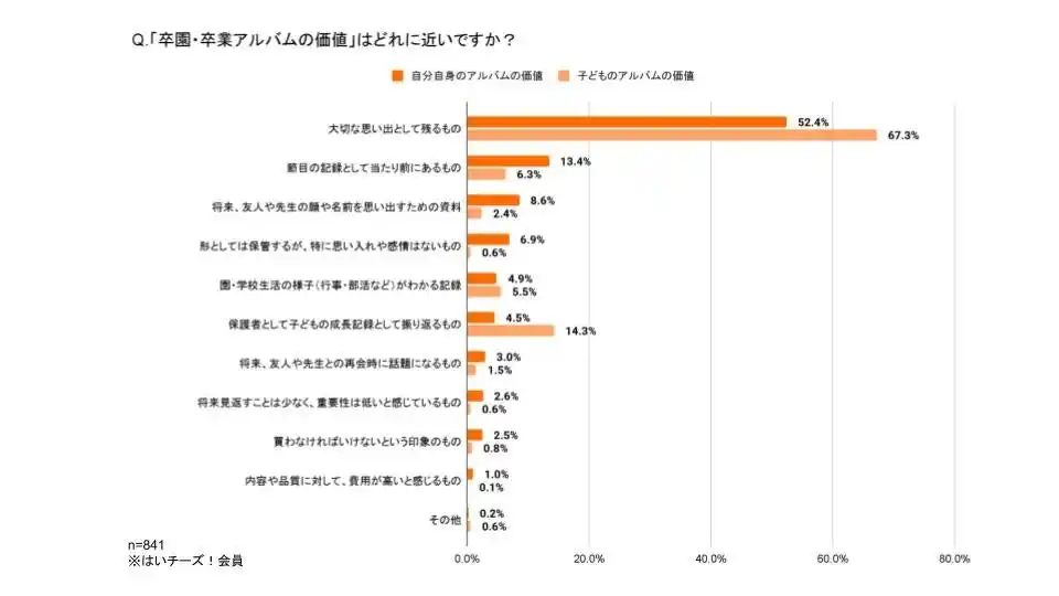 | ・保護者自身・子どもの卒園・卒業アルバムともに「大切な思い出として残るもの」という価値がトップ |