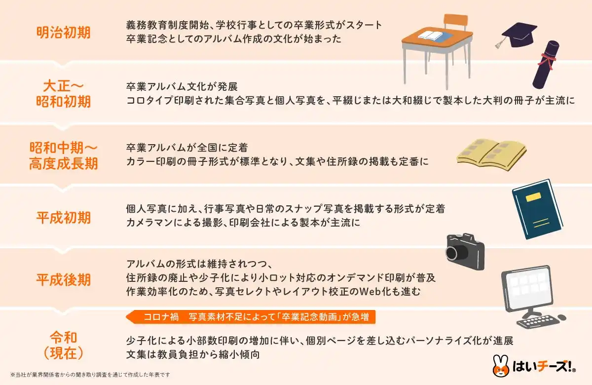 | 卒園・卒業アルバムは時代とともに変化してきました。 |