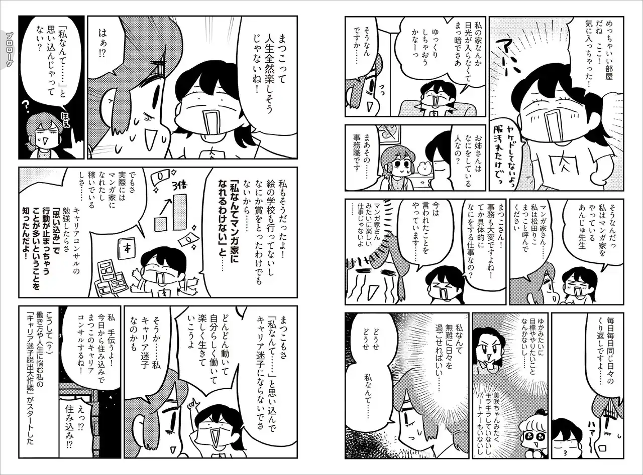 | 本書は、選択肢が多すぎて「自分はどんな働き方が合っているのか分からない」と悩む“キャリア迷子”の方に向けた、マンガで読めるキャリア実用書です。 主人公は、29歳の会社員・まつこ。自分の強みが見つからず、将来にも漠然とした不安を抱えている中で〈あんじゅ先生〉と出会い、少しずつ対話を重ねながら、自分らしい働き方を見つけていきます。