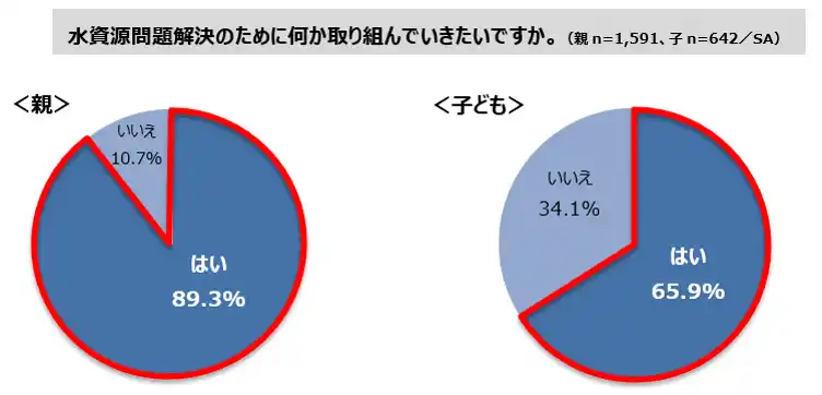 今後水資源問題を解決するために何か取り組んでいきたいと回答した人は親で89.3%、子どもで65.9%。