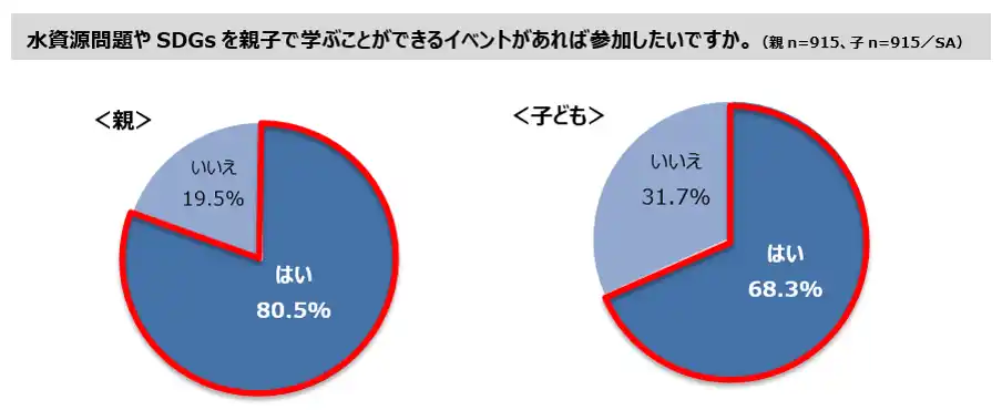| 92.7%の親が「子どもに水資源問題やSDGsについて学ばせたい」と回答。また水資源問題やSDGsを親子で学ぶことができるイベントがあれば参加したいか質問したところ、「参加したい」と回答した人は親で80.5%、子どもで68.3%。 |  |  |