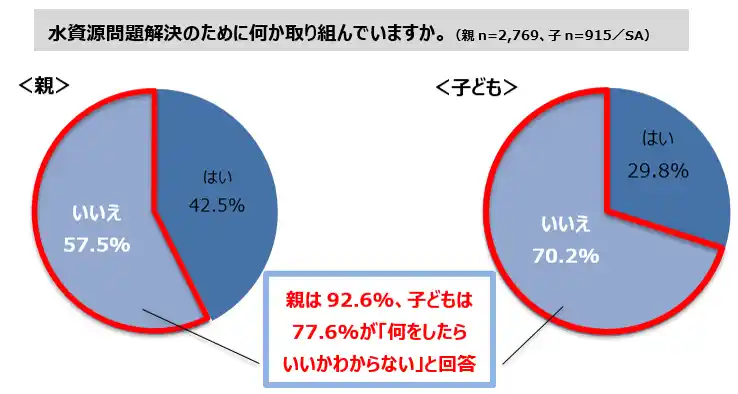 | 水資源問題解決のために何か取り組んでいるか質問したところ、取り組んでいないと回答した人は親で57.5%、子どもで70.2%も。また取り組んでいない理由は親子ともに「何をしたらいいかがわからない」が1位に。 |  |  |