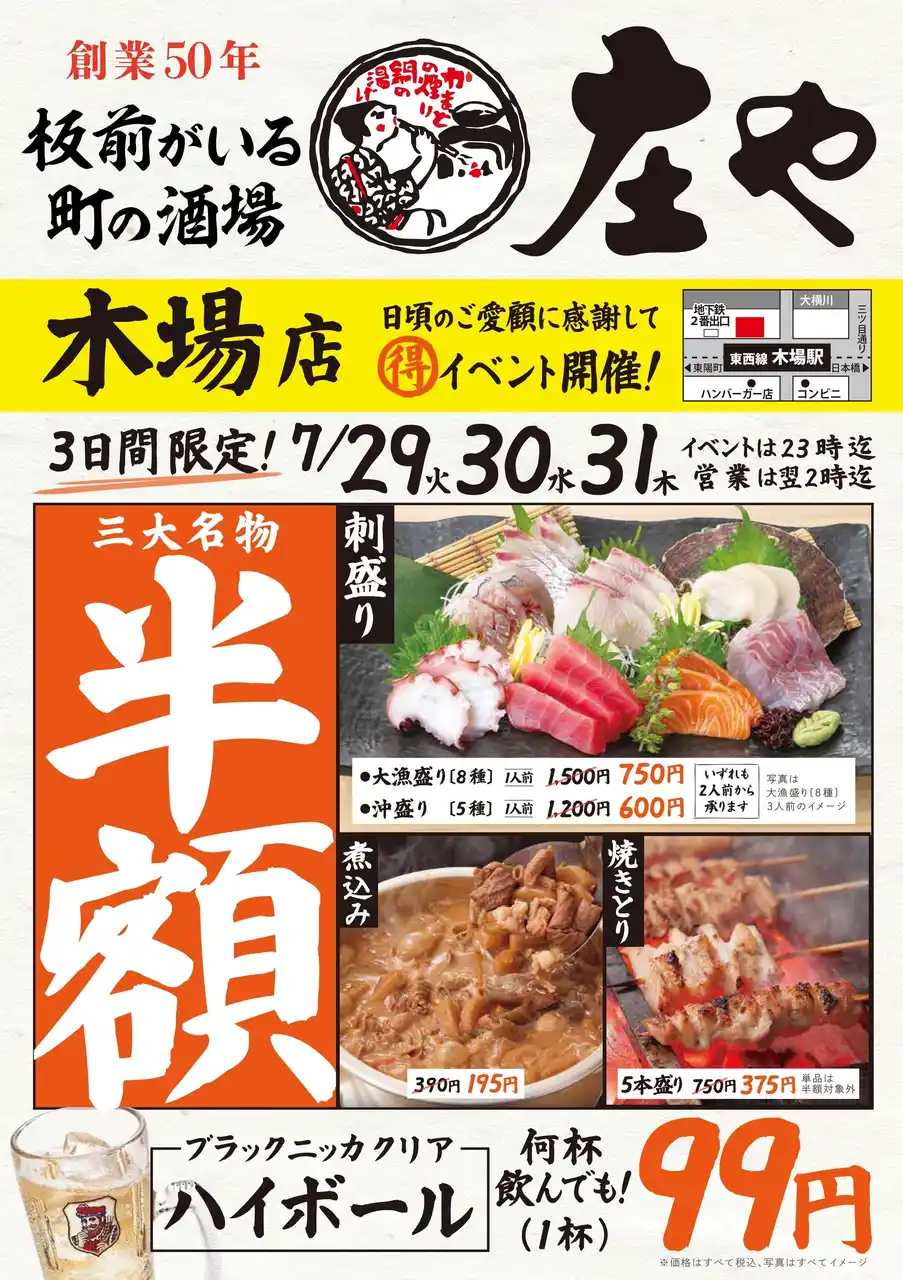 「はい!よろこんで」でお馴染みの“板前がいる町の酒場”『庄や』木場店(運営:株式会社大庄)は、2025年7月29日(火)より7月31日(木)までの3日間限定で、日頃のご愛顧に感謝を込め「刺身盛り合わせ」「煮込み」「焼き鳥」の三大名物を半額とする“半額感謝祭”を実施します。豊洲仲卸直送の鮮魚を使った刺身盛り合わせ「大漁盛り(8種盛)」は、通常1人前1,500円を半額の750円、同「沖盛り(5種盛)」は通常1人前1,200円を600円にて。加えて、不動の人気「煮込み」は通常390円を半額の195円。さらに、創業から受け継がれる味わい「焼きとり五本盛り」は、通常750円のところ半額の375円での超特価で提供します。