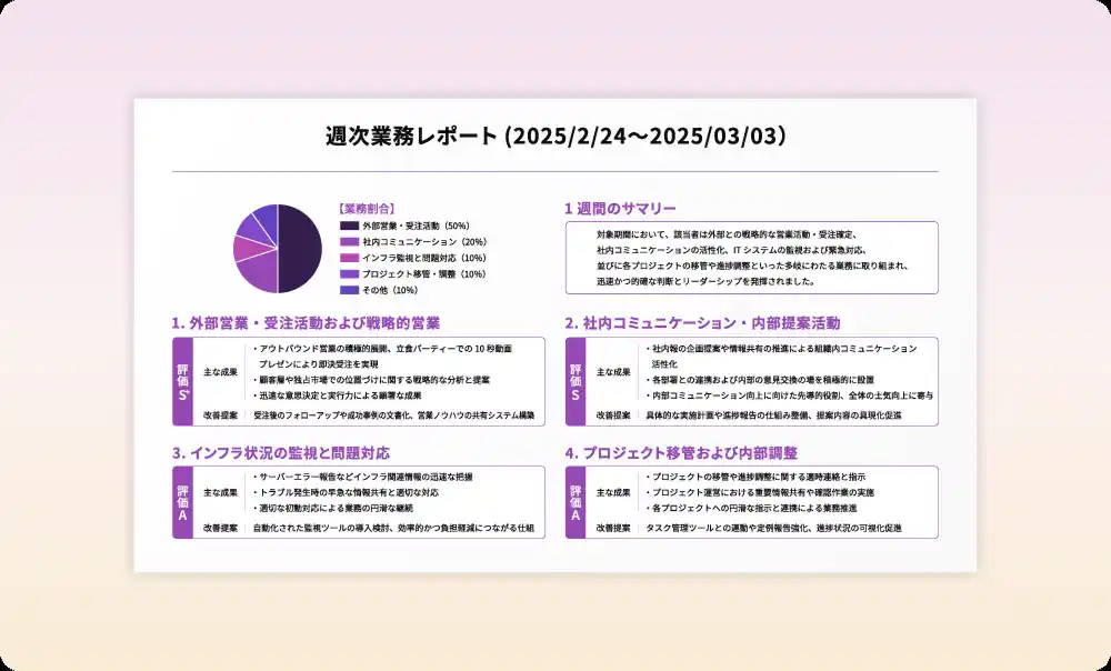 | 社員個別に出力されるレポートを通じ、1人ひとりの業務の内容を詳細に把握可能。改善点やアドバイスも提示されます。これらの把握に至るまでの作業はAIにまかせ、時間を大幅に削減。その後のマネジメントや業務改善に注力することが可能となります。 |