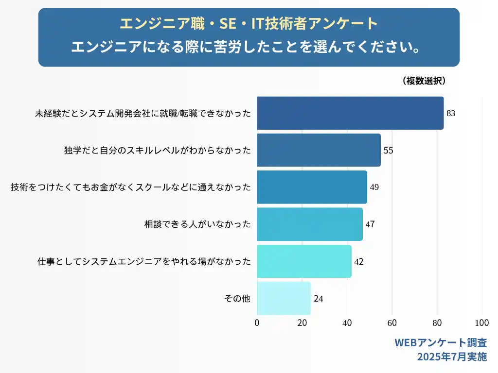 | 未経験からエンジニアを目指す人の多くが、最初の一歩でつまずいています。今回の調査では、「未経験では就職できなかった」「学習の方法がわからなかった」「相談できる相手がいなかった」といった、エンジニアが直面する“3つの壁”が浮き彫りになりました。 |