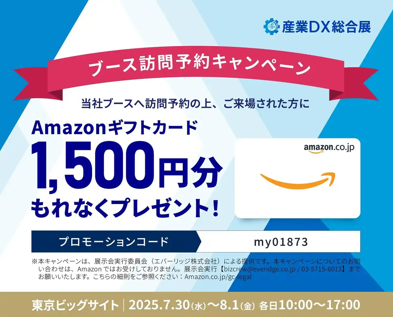 | 当社ブースへ訪問予約のうえ、ぜひご来場ください。プロモーションコードのご入力、ブース訪問予約、および当日のアポイント実施でAmazonギフトカード(1,500円分)をもれなく進呈します。 |