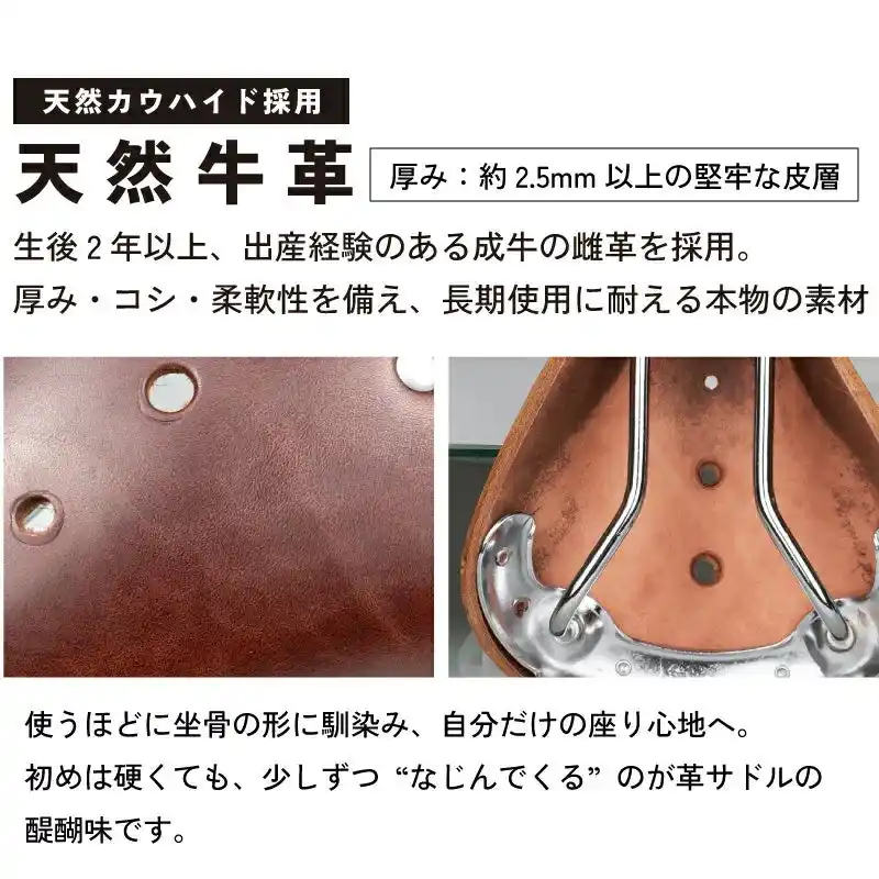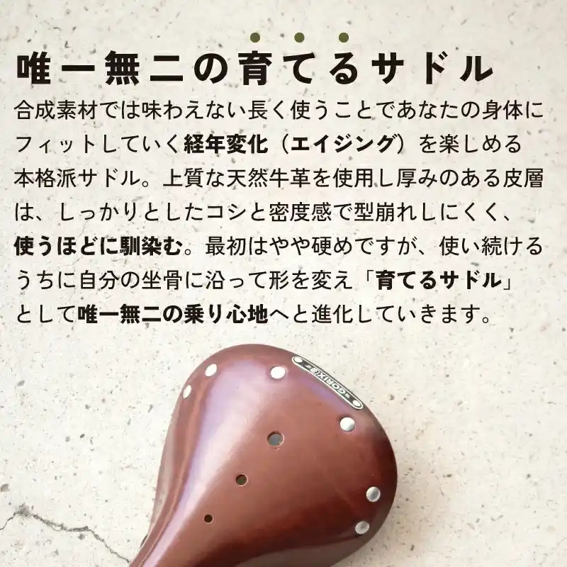 | 合皮のように剥がれず、使うほどに味が出て愛着も増す“育てるサドル”です。 | ||||||||||||||||||