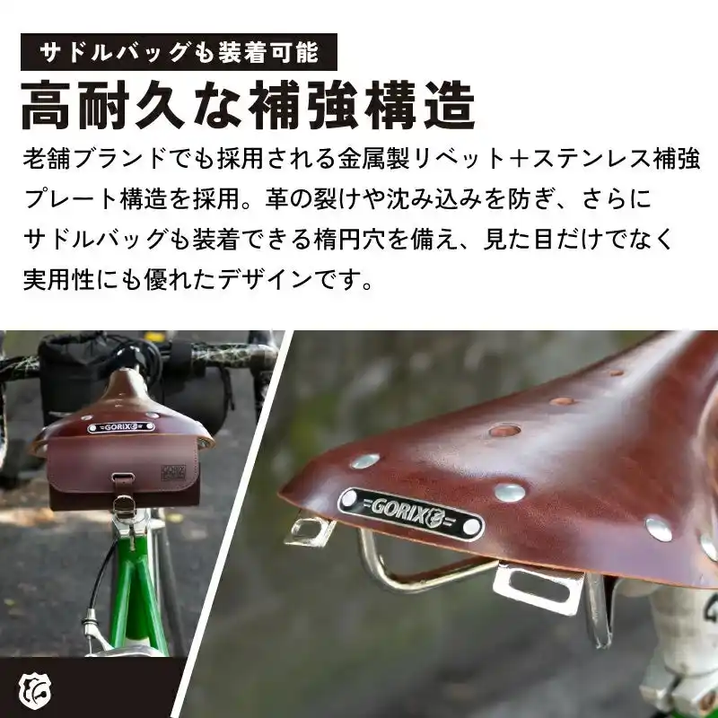 まさに合成素材では味わえない「育てるサドル」として唯一無二の乗り心地へと進化していきます。 また、後部には老舗ブランドでも採用される金属製リベット+ステンレス補強プレート構造を採用し、革の裂けや沈み込みを防ぎ、さらにサドルバッグも装着できる楕円穴を備え、 |