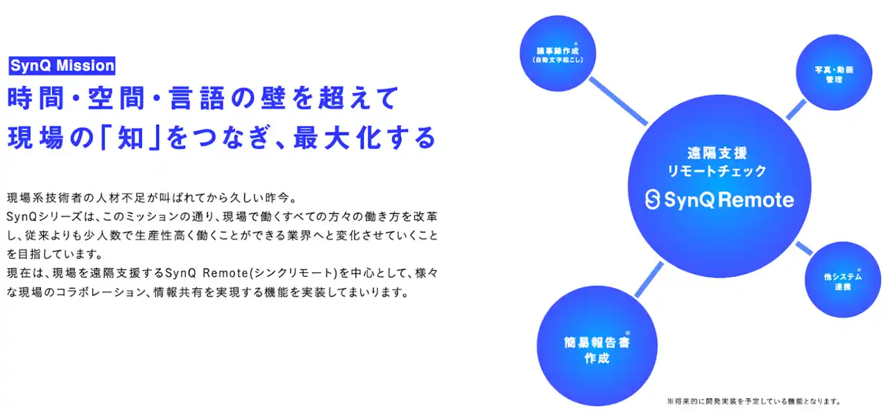 「地域産業・レガシー産業のアップデート」をミッションに掲げる福岡・北九州発のスタートアップ。日本の社会課題である「技術者不足・労働力不足」をDXで解決するため、「移動時間の削減」に着目し、現場に特化した遠隔支援のためのビデオ通話ツール「SynQ