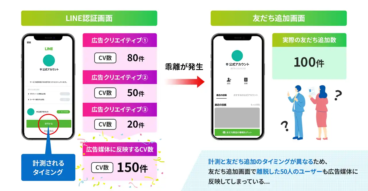 従来の計測方法の多くは、「LINEログイン」ボタンが押された時点でCVとして計測し、広告媒体に反映していました。しかし、その後表示される「友だち追加画面」で離脱してしまっても、CVとして計測されてしまうため、広告管理画面上のCV数と実際に増えた友だちの数がズレが生じるという問題が発生していました。