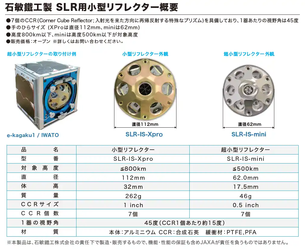 【製品概要】 ■ 製品名:SLR用小型リフレクター / SLR用超小型リフレクター ■ 発売日:2025年7月30日 ■ 特長:軽量・コンパクト設計、高反射率、耐環境性能(温度変動・放射線・衝撃耐性) ■ 主な用途:人工衛星搭載用リフレクター(衛星レーザー測距システム向け) ■ 詳細情報:https://www.ishitoshi.co.jp/slr/ |
