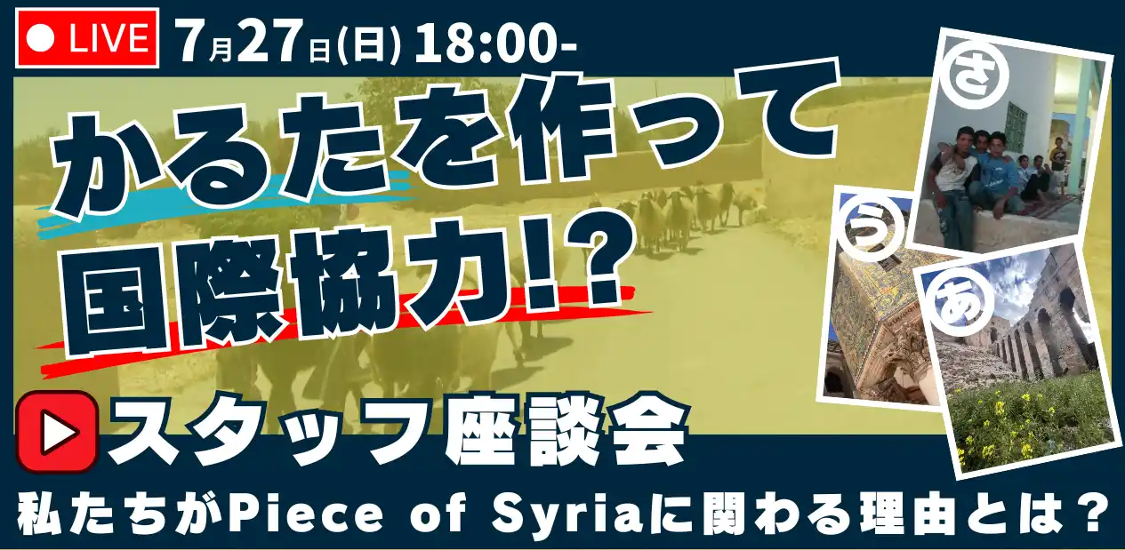 | Piece of Syriaは、「シリアかるた」を作成し、シリアの魅力を伝えるワークショップの新教材を開発します。あなたのシリアの写真・体験談で一緒に作りませんか? |