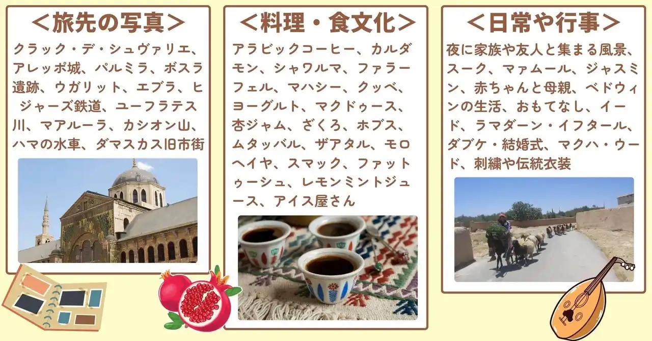 | 日本では、「シリア=戦争のある遠い国の話」と思われがちですが、日常の豊かさに触れることで「こんな生活があったんだ」「これが失われたのか」と感じるのではないでしょうか?その気づきが、戦争の重さや平和の意味を、私たち自身の暮らしと重ねて考えるきっかけになる、と私たちは考えます。 | ||||||||