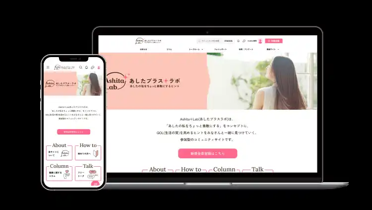 | 「Ashita+Lab(あしたプラスラボ)」は、“あしたの私をちょっと素敵にする” をコンセプトに、QOL(生活の質)向上をテーマとした情報発信・交流型のコミュニティサイトです。 | |||