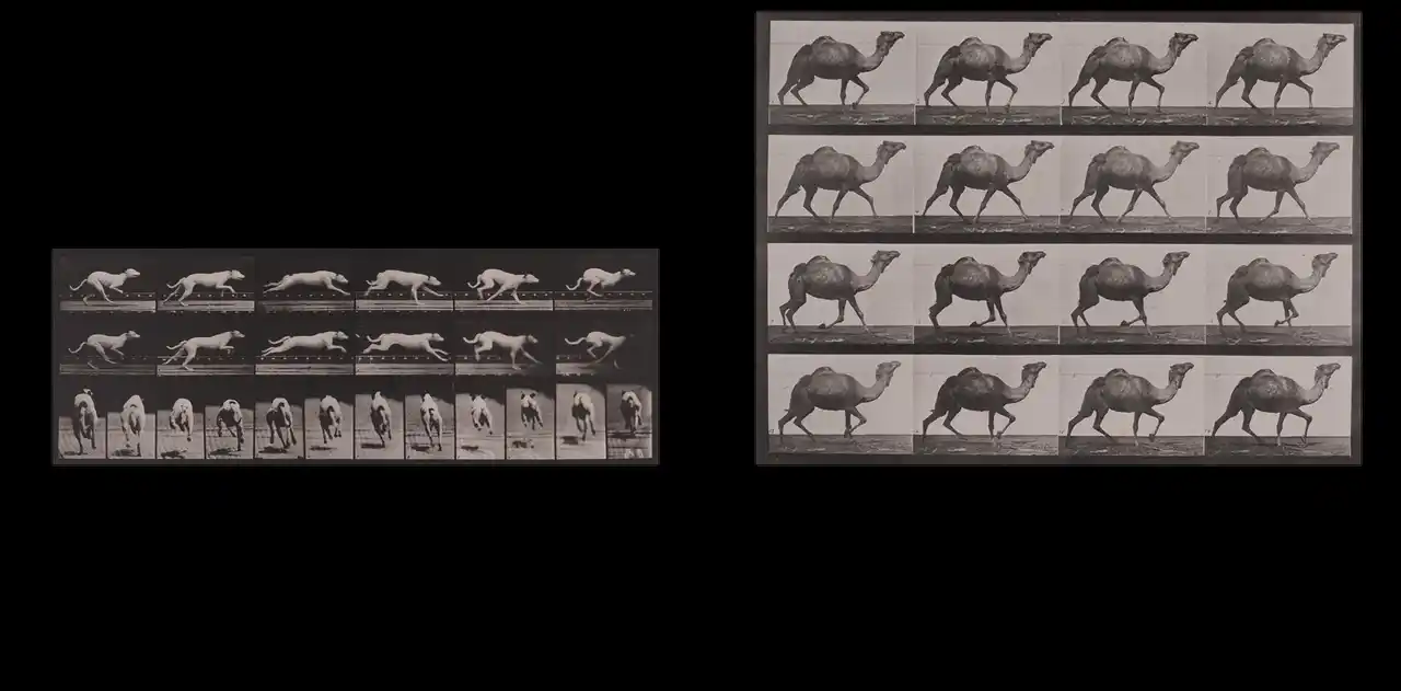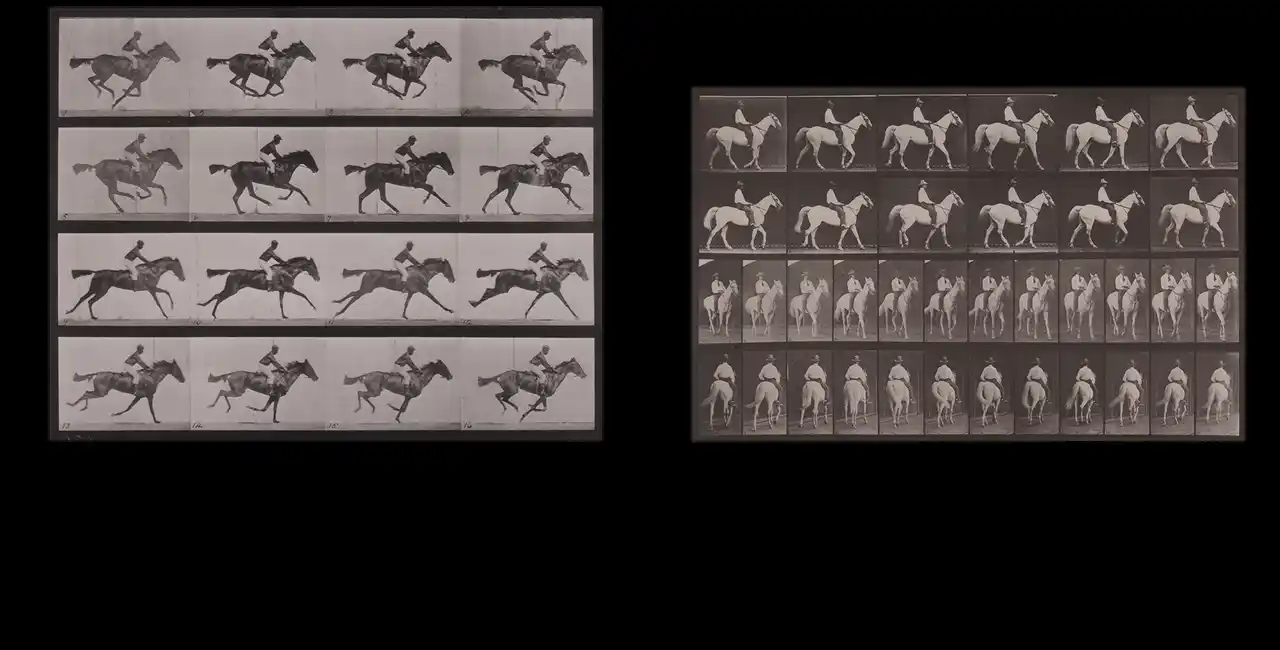 エドワード・マイブリッジ(1830-1904)は、今から約150年前、世界で初めて、走る馬の連続写真の撮影を成功させた人物です。映画や動画、アニメーションの先駆者として、視覚芸術の歴史において最も偉大な写真家の一人とされています。1872年、マイブリッジは、実業家で元カリフォルニア州知事のリーランド・スタンフォードから依頼されたことをきっかけに走る馬の撮影実験を始め、1877年、走っている馬が胴体の下に四肢すべてを折りたたみ宙に浮いている一瞬を撮影することに成功。