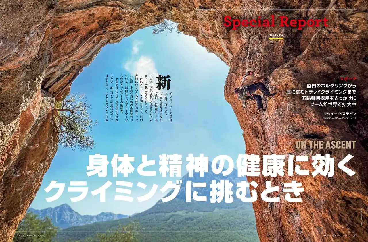 日本では登山ブームが続いていますが、世界では一歩進んでクライミングが大流行しています。きっかけは五輪のボルダリング競技の採用。ジムでトレーニングを兼ねて人工の壁登りを楽しむ人が増え、そこから実際の山に挑む人が増えているそうです。夢中になる人とが増えるのは、クライミングが心と体の健康に効くから。 「肉体だけでなく頭脳も駆使しなくてはならず、それを通じて目の前のことに集中できる……集中力を維持する能力が役立つことは、人生において驚くほど多い」と、7月23日発売号の特集「山に挑む」でニューズウィーク英語版シニアエディターのマシュー・トステビンは書いています。彼自身がクライミングの魅力に取り憑かれ、記事ではトルコ南部で人気のゲイイクバイウルに挑む様子をルポ。特集では、世界のクライミング名所11カ所と「クライミングは大変……」という人向けに世界のトレッキング名峰5山も紹介しています。(長岡)