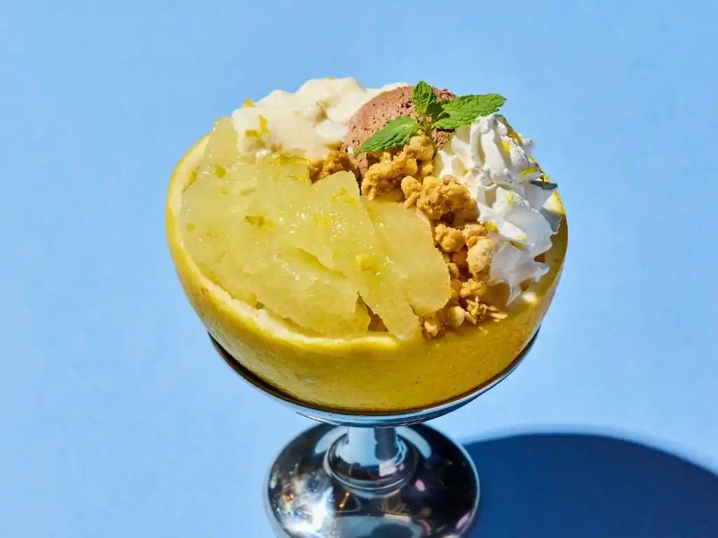 50食限定販売の「土佐文旦アラモード」は、文旦の特徴的な酸味と、爽やかでスッキリとした味わいを最大限に引き出すため、相性の良いチョコレートアイスやなめらかなパンナコッタ、果汁入りのゼリー、そしてサクサクとした食感が楽しいグラノーラを組み合わせています。さらに、文旦そのものを器として用い、皮・果実・果汁のすべてを余すことなく使い切ることで、まるごと一個の文旦を贅沢なスイーツへと昇華させました。 |