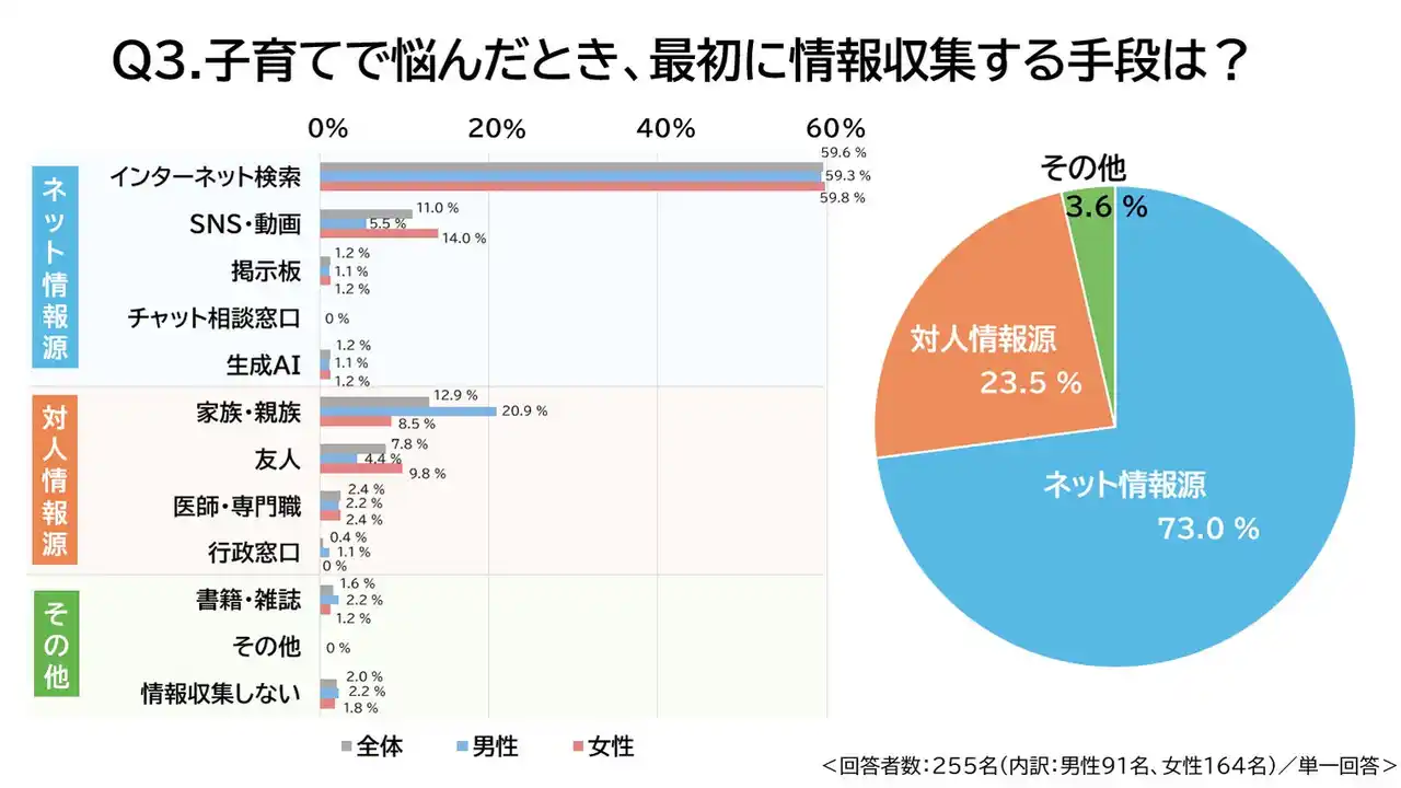 この結果から、妊娠・育児期の親の情報収集はまず「ネットで調べる」が主流であり、人に相談するステップは後回しになりがちな傾向が浮き彫りになりました。 |
