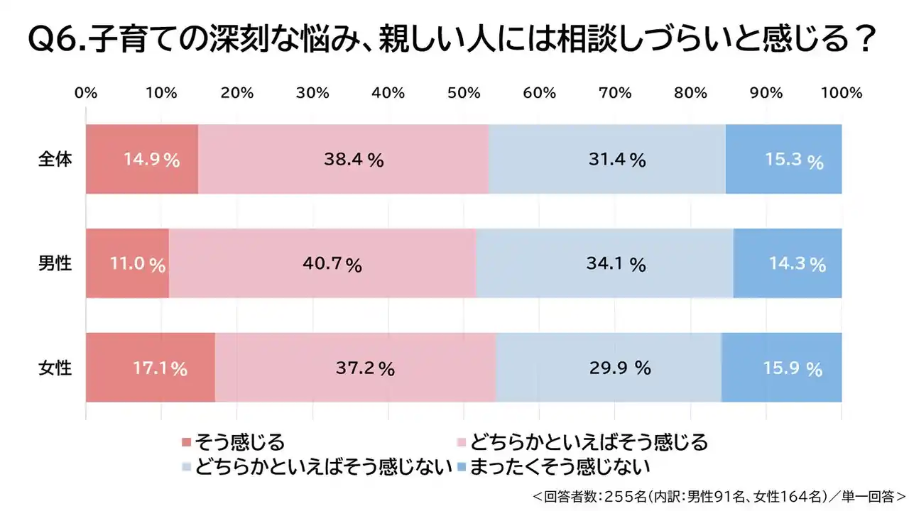 6.親しい人に感じる育児相談のハードル しかし、親しい人に相談できるかといえば必ずしもそうではなさそうです。「子育てにおいて深刻な悩みが発生したとき、親しい人に相談しにくいと感じたことはあるか」という質問に対し、「そう感じる」と回答した方が14.9%、「どちらかといえばそう感じる」と回答した方が38.4%で、合計53.3%の方が相談へのハードルを感じているようです。 |
