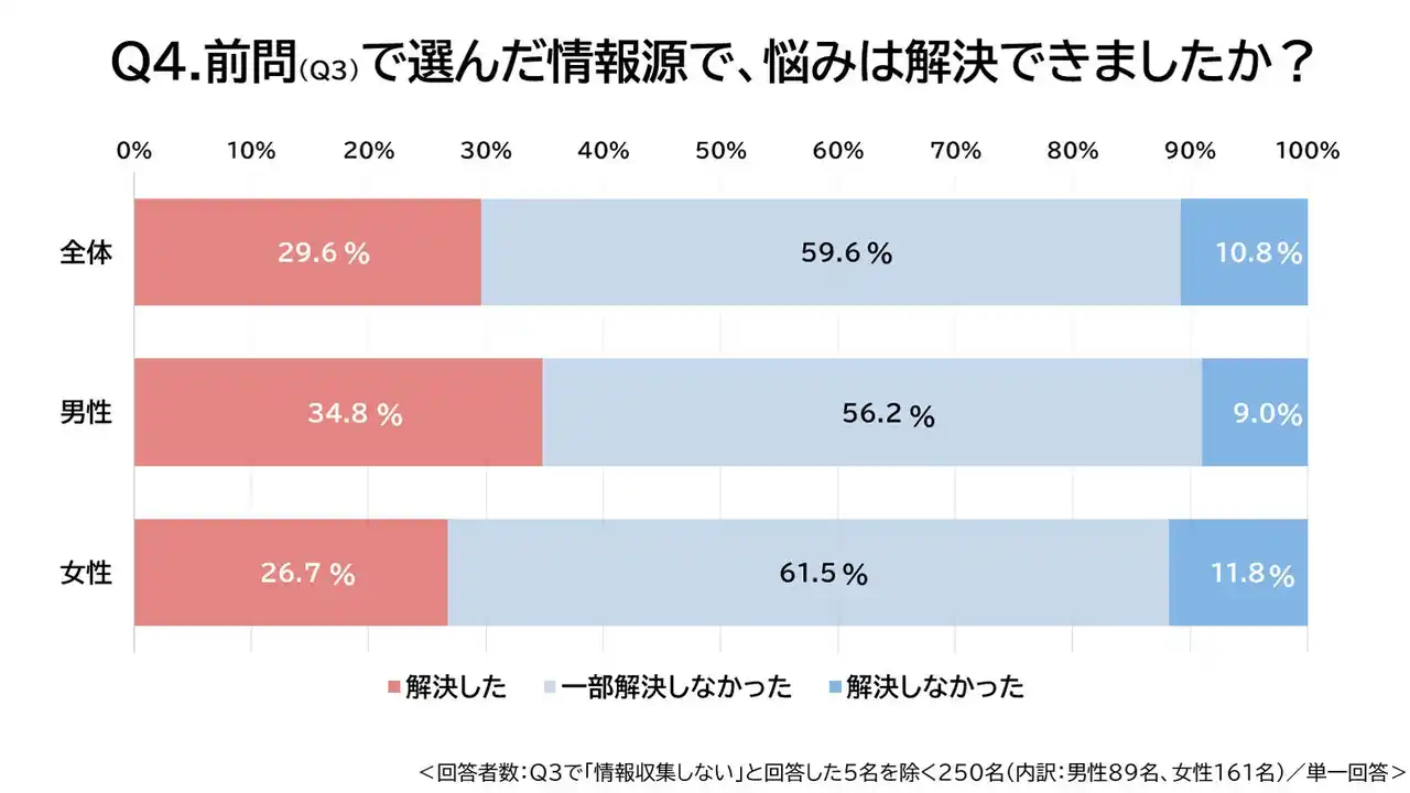 4.最初の情報収集で悩みは解決しない 「前問で選択した“最初の情報収集手段”で悩みは解決できたか」を尋ねたところ、59.6%が「一部解決しなかった」、10.8%が「解決しなかった」と回答し、合わせて70.4%が十分に解決できていない実態が明らかになりました。多くの子育て世代の悩み解決手段は、インターネット検索やSNSなど“手軽なネット情報”に頼りつつも、それだけでは答えにたどり着けていない状況が推察できます。 |