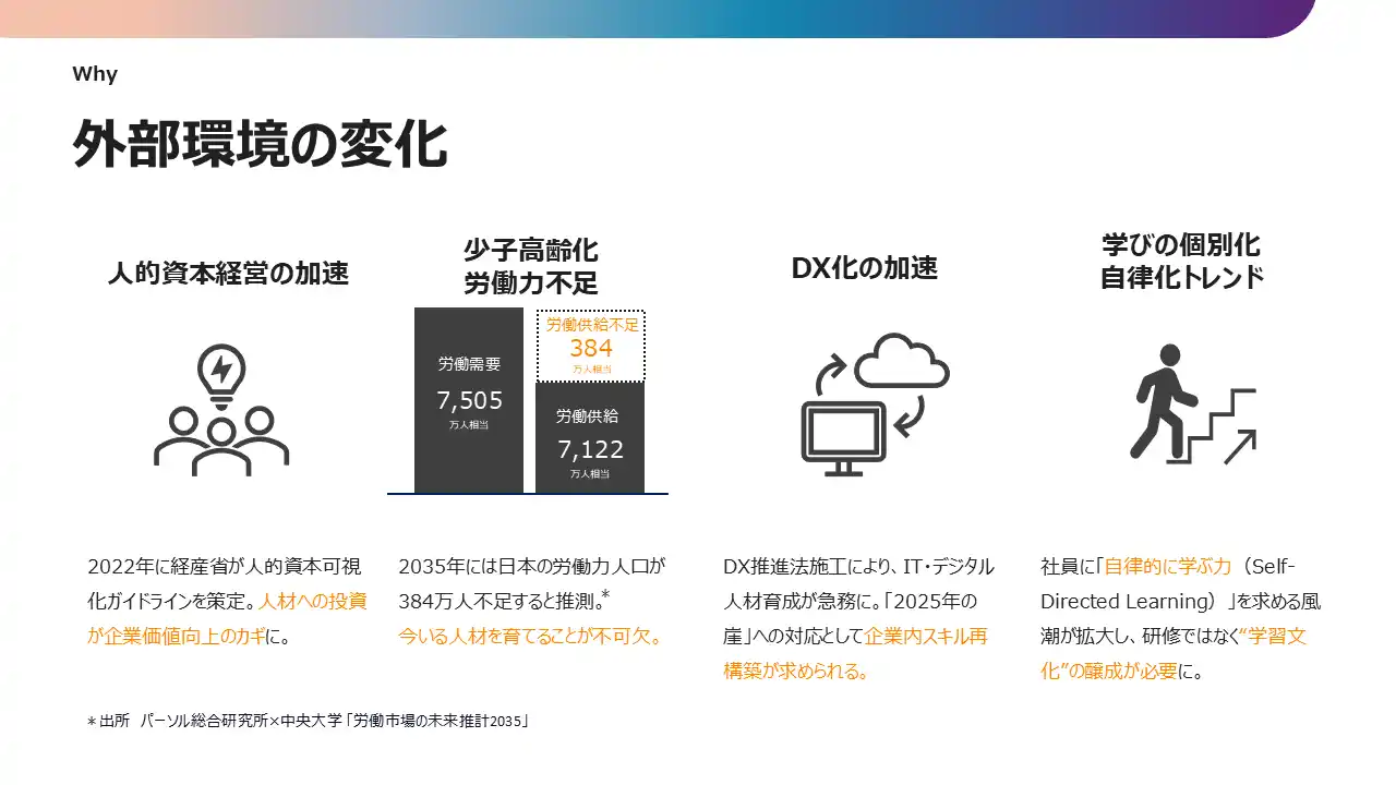 現代の企業を取り巻く環境は、かつてないスピードで変化しています。(※図1)テクノロジーの進化、価値観の多様化、労働力不足など、多くの要因が絡み合い、組織が従業員に一方的に学びを与える従来の人材育成手法では対応しきれない状況が生まれています。 |