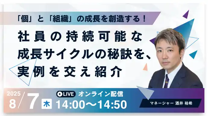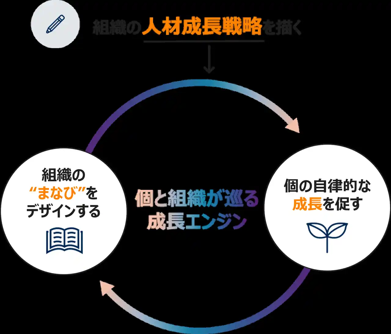 組織の成長を支えるのは、そこではたらく「個」の成長。 その「個」を育てるのは、戦略的な育成環境。これらを通じて、「個」と「組織」の成長が循環し、企業の中に持続可能な成長文化を生み出します。 |
