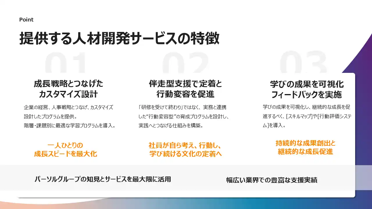 「個」と「組織」の成長をデザインし、実行まで伴走。持続可能な成長サイクルを生み出します。 |