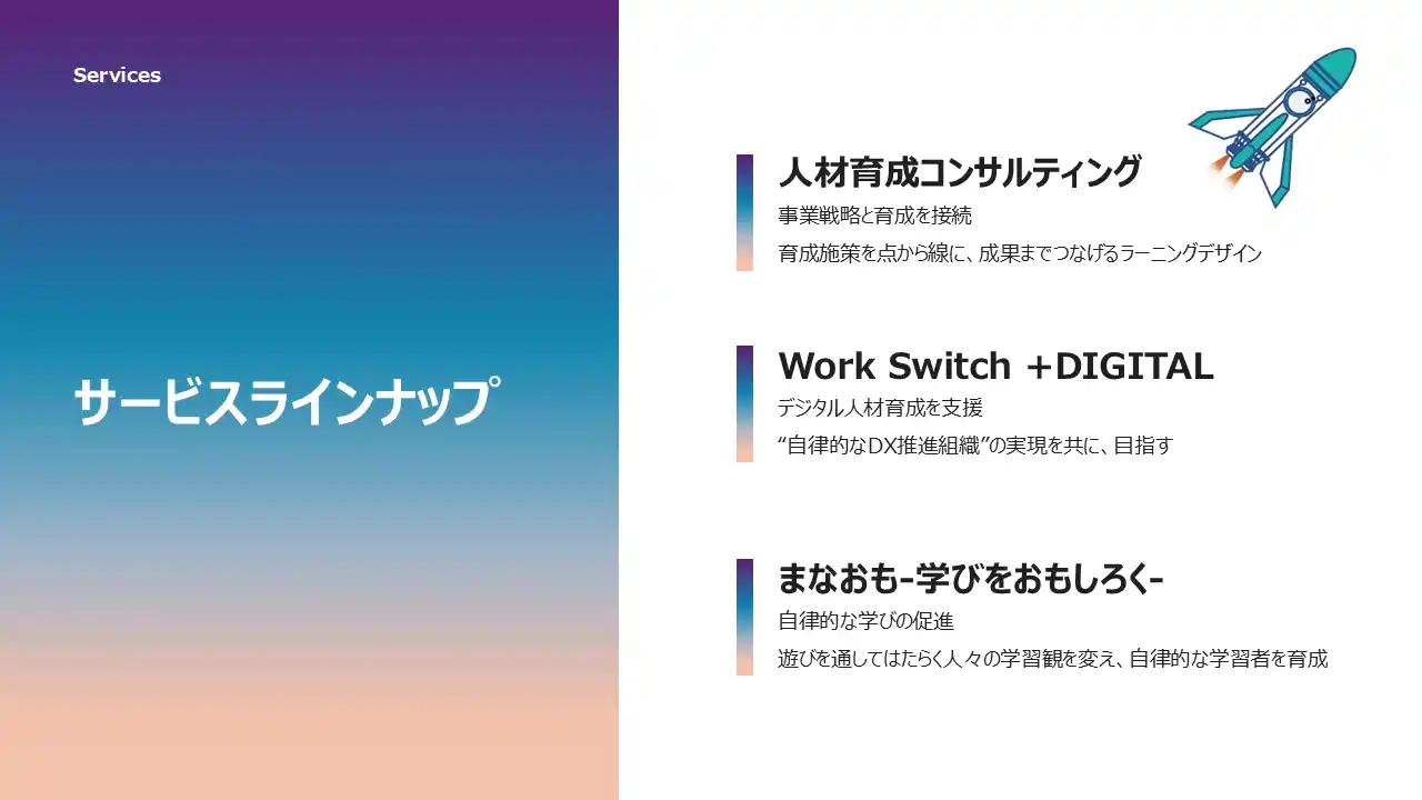 「はたらいて、笑おう。」をビジョンに掲げるパーソルグループのパーソルワークスイッチコンサルティング株式会社(本社:東京都千代田区、代表取締役社長:小野 隆正、以下「パーソルWSC」)は、デジタルに特化した人材育成サービス「Work Switch +DIGITAL」を提供してまいりましたが、このたび新たなサービスとして「人材開発サービス」の提供を開始し、総合公式サイトを開設いたしました。 「業務とテクノロジーコンサルティングで“はたらき方を転換”する」をミッションとするパーソルWSCとして初の人材育成に特化したラインナップです。 |