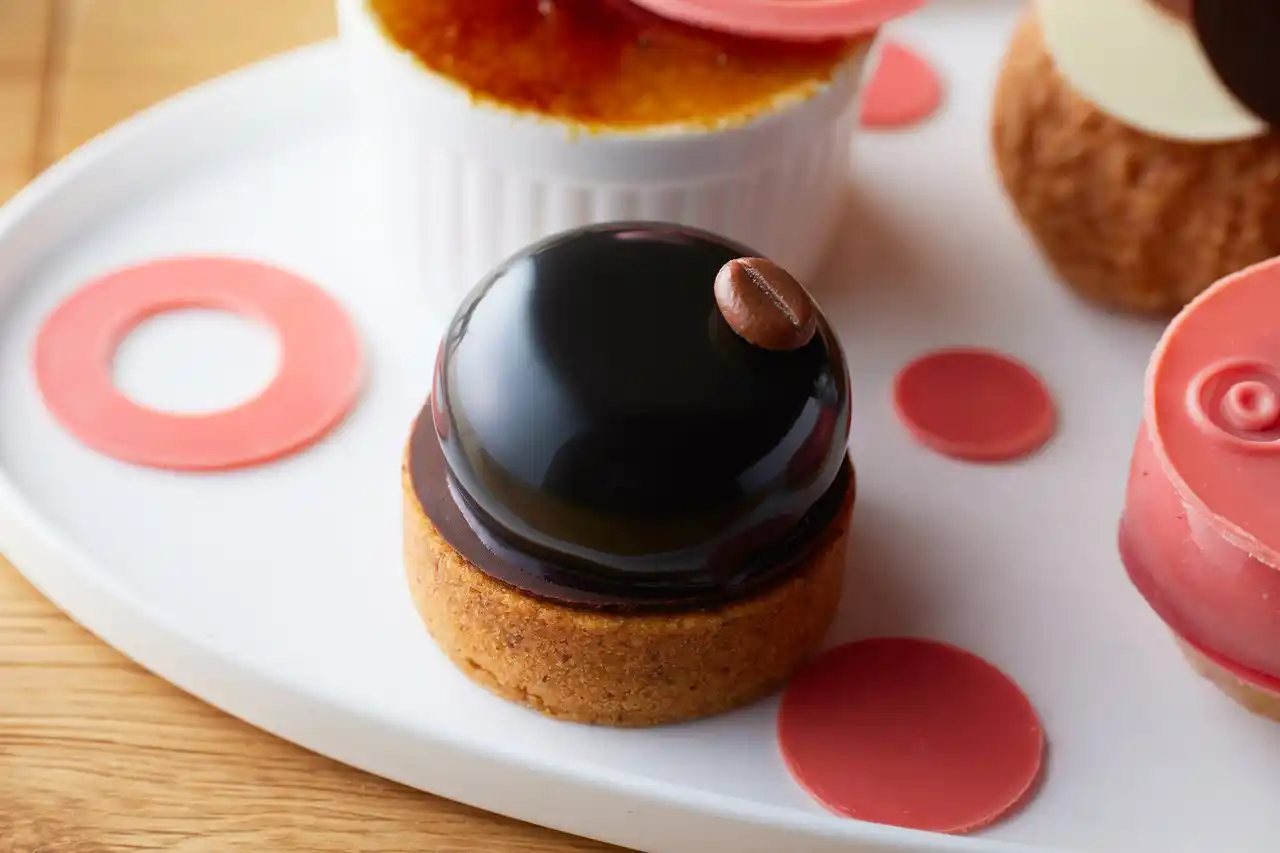 アーモンド生地にキャラメルナッツを詰め、エスプレッソムースを重ねたタルトを、艶やかな竹炭のチョコレートでコーティングしました。香ばしさとほろ苦さが織りなす、奥行きのある味わいが魅力のタルトに仕上げました。 |