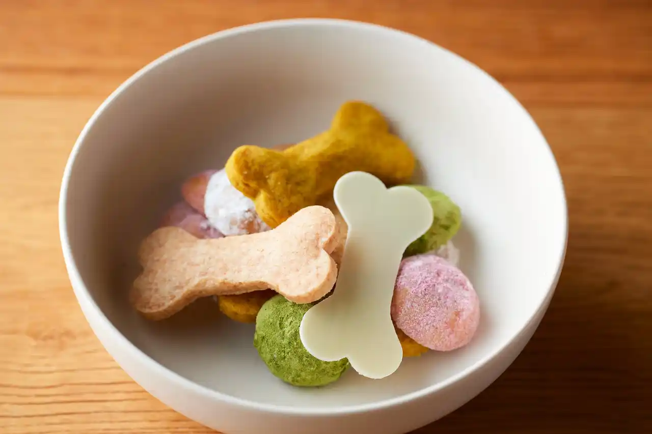 aiboのごはん“アイボカリカリ”をイメージした、遊び心あふれるプレート。オーガニックシュガーで仕上げたプレーンクッキーや、チーズやターメリックを加えた黄色い骨型クッキー、ホワイトチョコレートの骨型チョコレートに、ラズベリー・バニラ・抹茶のクッキーを添えました。見た目にも楽しく、思わず笑みがこぼれるような可愛らしい一皿。 |