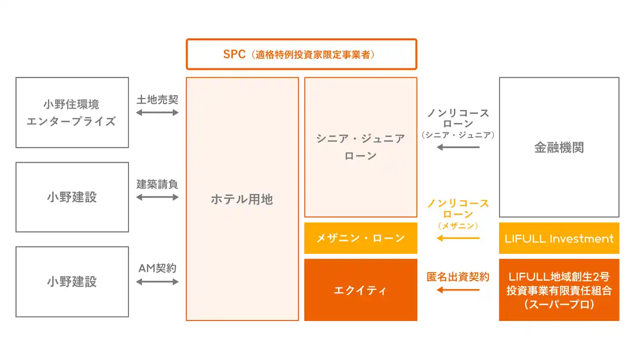 LIFULL Investmentが運営する本2号ファンドは、日本国内にある不動産等の利活用により、地域創生・地域活性に資する事業に資金を供給することをミッションとしております。本事業では、LIFULL地域創生1号ファンドにて活用実績がある、不動産特定共同事業法における適格特例投資家限定事業(スーパープロ投資家限定事業)スキームを活用し、本事業のために新たに設立した特別目的法人(SPC)に対して出資を行います。なお、本事業においては本2号ファンドからの出資だけでなく、LIFULL Investmentからメザニンローンを提供しています。 |