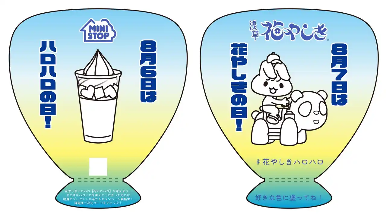 | 今回のコラボレーションイベントは8月6日(水)がミニストップ夏の定番である「ハロハロの日」、8月7日(木)が「花やしきの日」と1日違いの記念日というご縁で暑い夏を一緒に乗りきるべく実現いたしました。両社の記念日はいずれも日本記念日協会の制定記念日です。両日の記念日をお祝いするぬり絵うちわの配布やSNSキャンペーンの実施、ミニストップの広報【ミミップくん】が来園するなどさまざまな施策をご用意しております。 | |||||||||