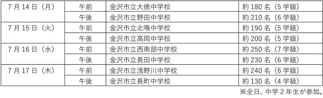 ■三谷産業金沢本社での「先端技術体験学習」実施日、実施校、生徒数(学級数) |