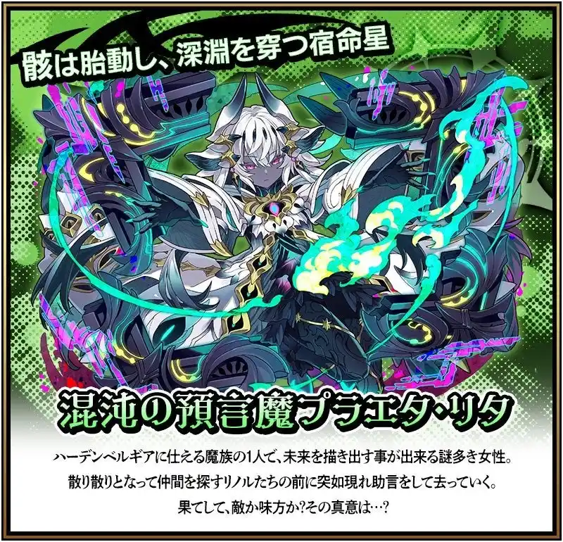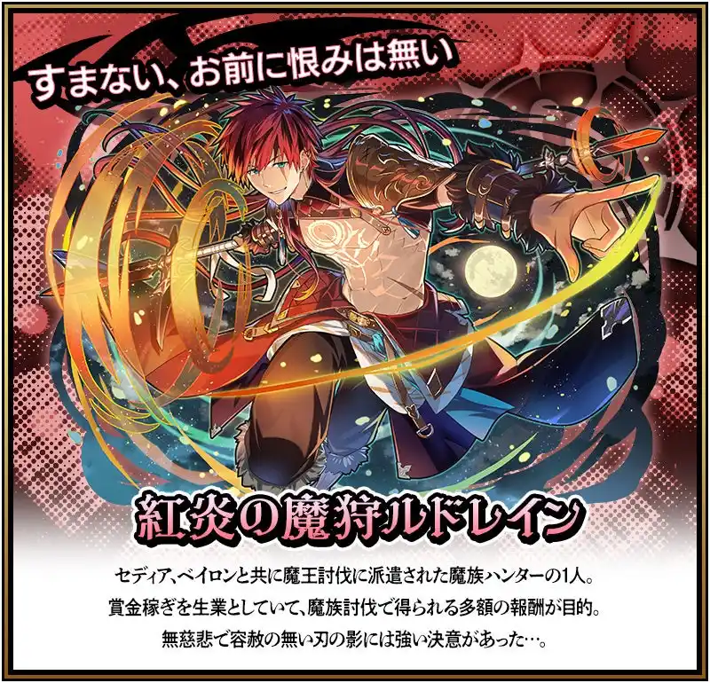 「混沌の預言魔プラエタ・リタ」「紅炎の魔狩ルドレイン」など、新たに登場するキャラクターがラインナップされたレアガチャを実施します。 |