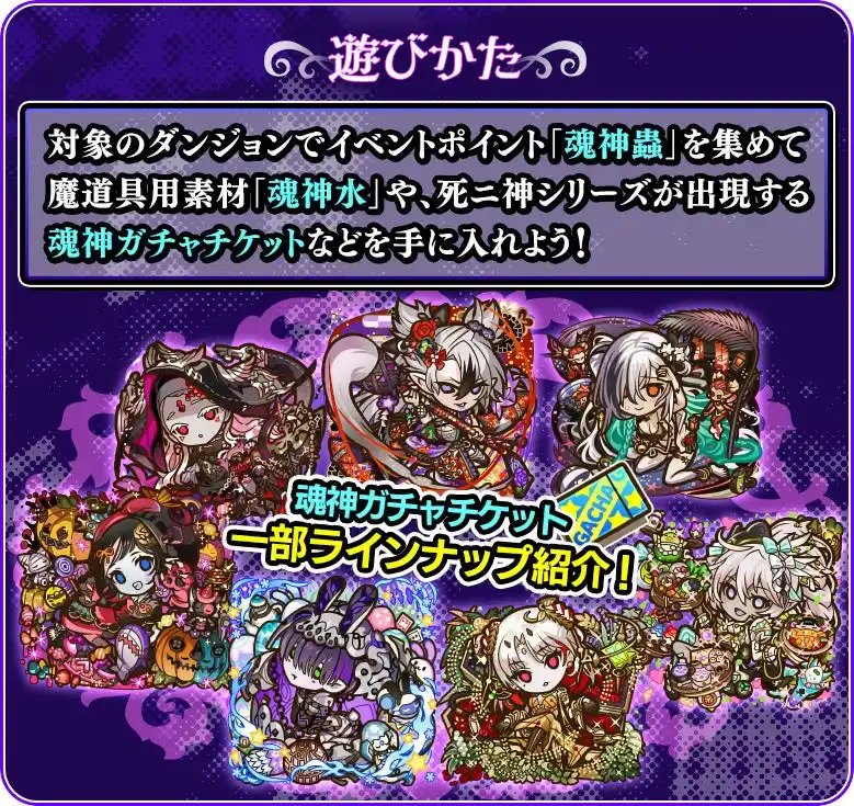 イベント期間中のログインで「起源の少女リノル」「暗霊の森人ベイロン」を1体ずつお知らせメールでお届けします。また、対象のダンジョンでイベントポイント「魂神蟲」を集めると、交換所で「魂神水」や死二神シリーズが出現する「魂神ガチャチケット」が入手できます。 |