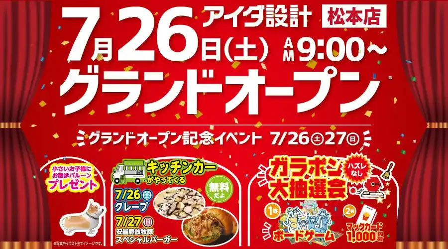 | 「松本店」は、お客様の理想の住まいを実現するための自由設計による注文住宅をご提案する店舗です。オープン当日の2日間はご来店のお客様を対象に、無料抽選会を実施。ご家族で楽しめるボードゲームなどの景品をご用意しております。さらに、各日限定でキッチンカーによるフードサービスも実施いたします。(いずれも無料) | |||||||||||||||