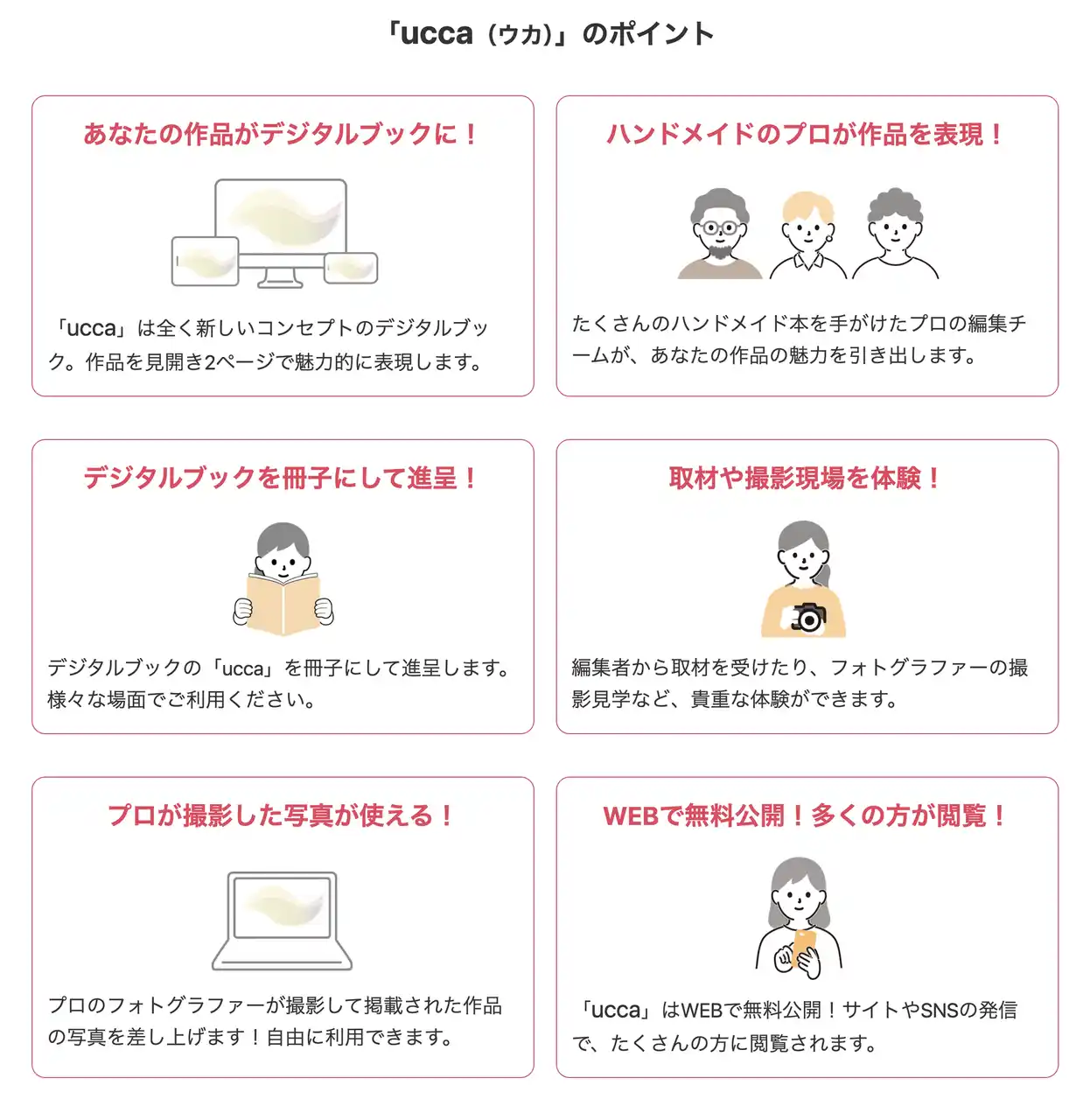 | 「ucca」創刊の想い。それは日々の仕事や生活の中でハンドメイドをこよなく愛しながらも、自分にとっての一歩をいつか踏み出したいと思っている方に、そのきっかけや学びになるような非日常の機会を創出したいという想いです。 | ||||||||||||||