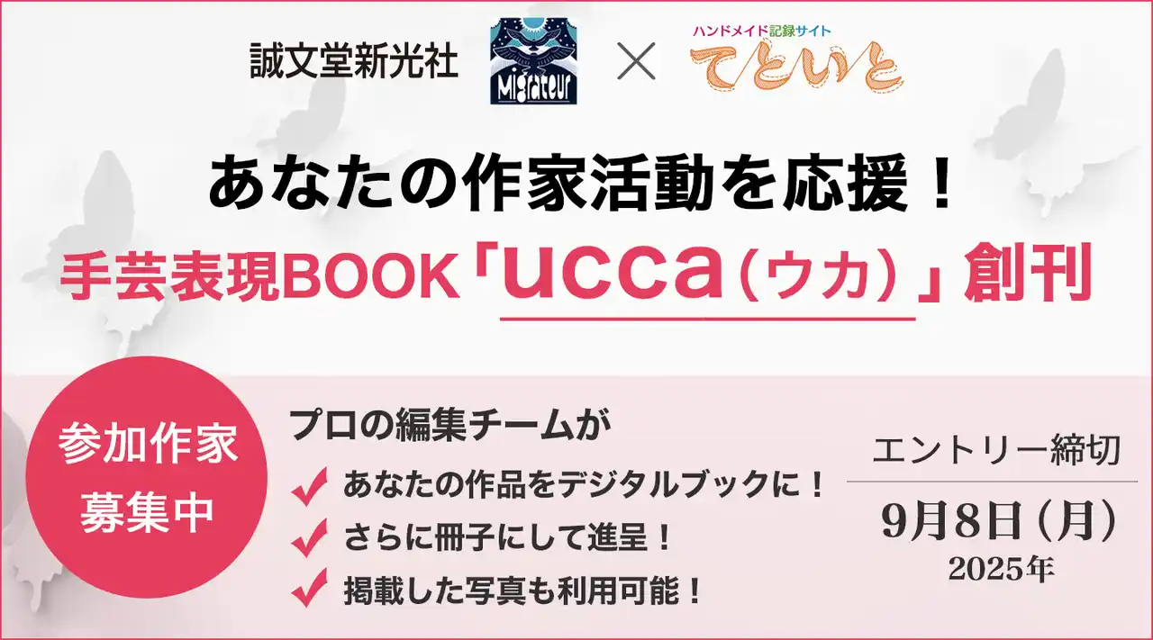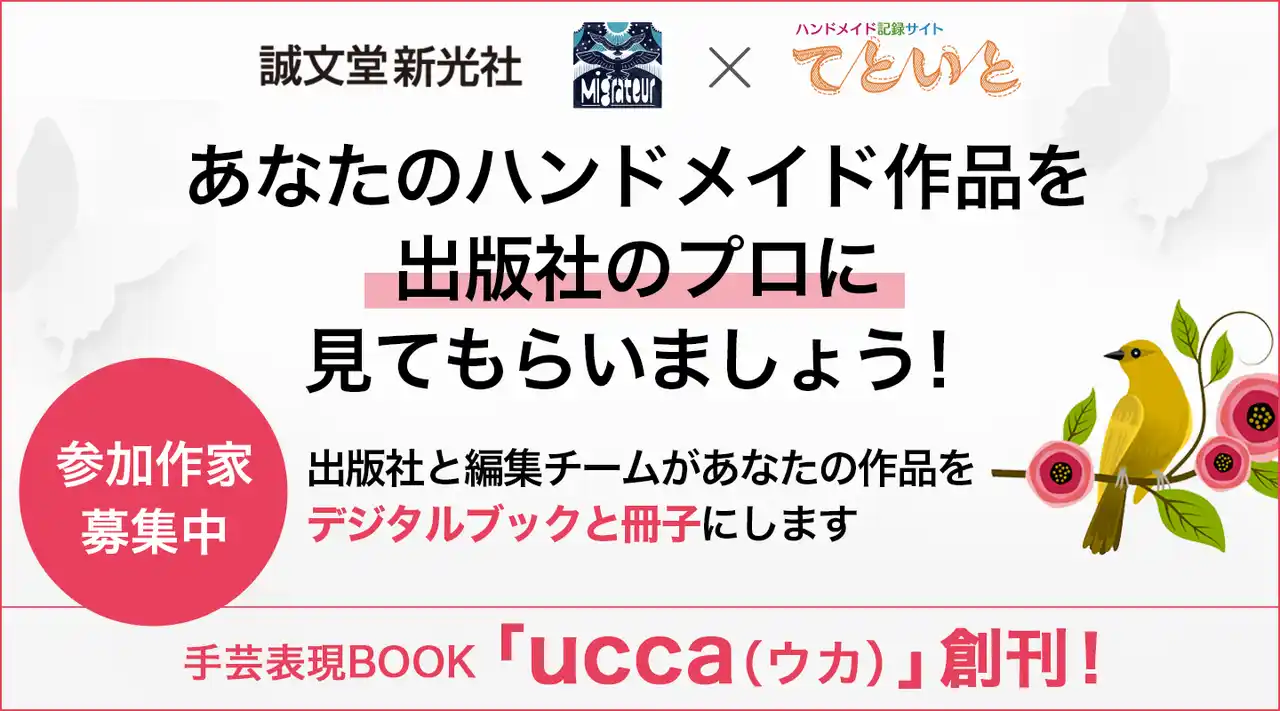 | 手芸Webマガジン「ミグラテール」とハンドメイド記録サイト「てといと」は、ハンドメイド作家さんの作品発表の新しい場として「ucca(ウカ)」を創刊。この「ucca(ウカ)」は、手芸本を作成する編集チームがあなたの作品をデジタルブックや冊子にしていくプロジェクト。ぜひ皆さんの作品の応募をお待ちしています! | ||||||||||||||