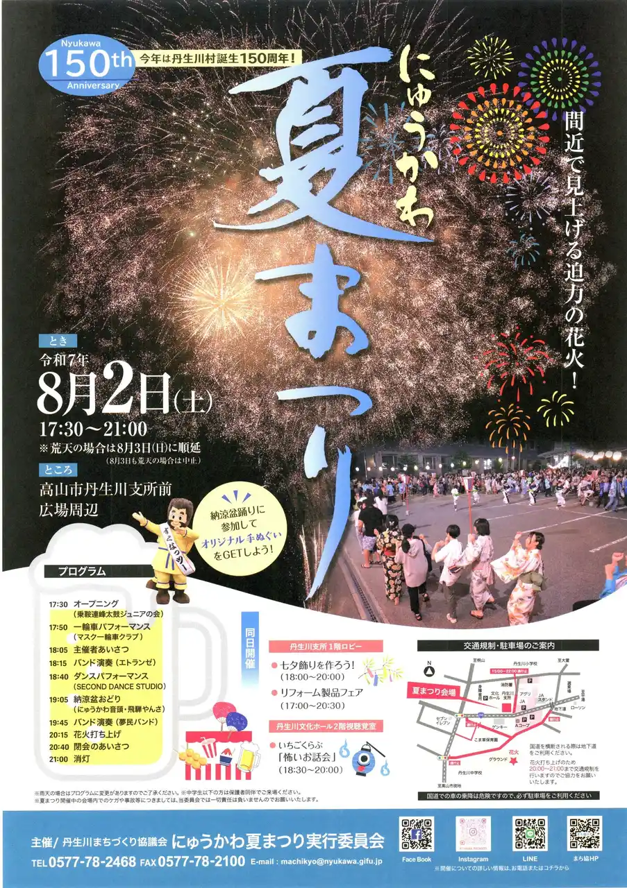 | 岐阜県高山市の丹生川地域で毎年恒例の「にゅうかわ夏まつり」が、2025年8月2日(土)に開催されます。主催は、にゅうかわ夏まつり実行委員会(丹生川まちづくり協議会)。地域住民はもちろん、県内外から多くの来場者で賑わう丹生川最大の夏イベントです。 | ||||||||||||||