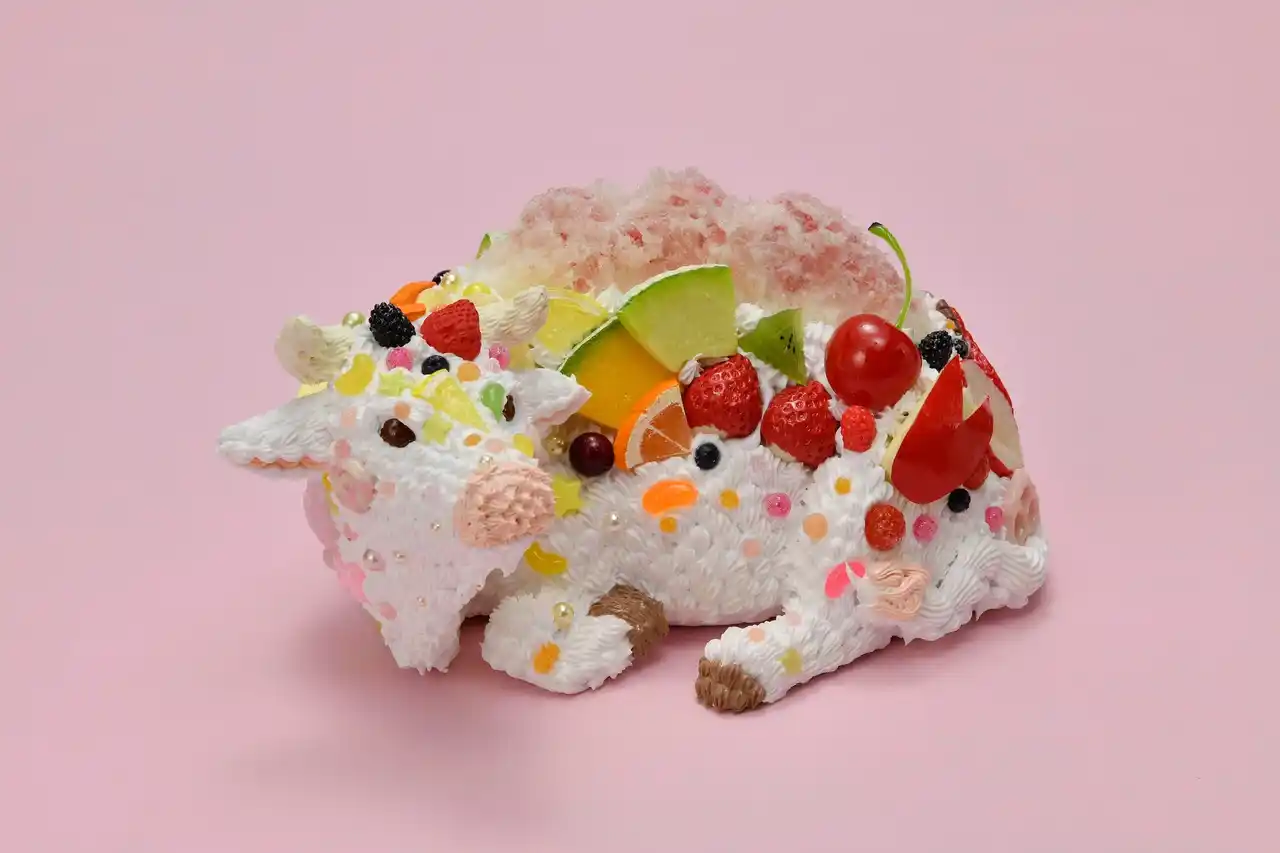 幼い頃に宮島で出会った鹿は特別な思い出として心に残っています。 可愛らしさもありながら、神の使いとして大切にされ、その神秘的な存在感に胸が高鳴ったのを今でも覚えています。 そうした記憶をもとに、本展では“お菓子の神様”と名付けた鹿の立体作品を発表します。キャンディやクリームで装飾された神聖で可笑しみのある姿は、子ども時代の驚きと憧れをそのまま形にしたものです。 |