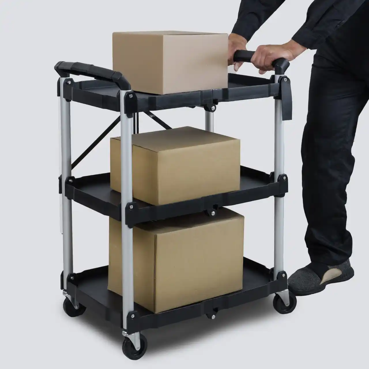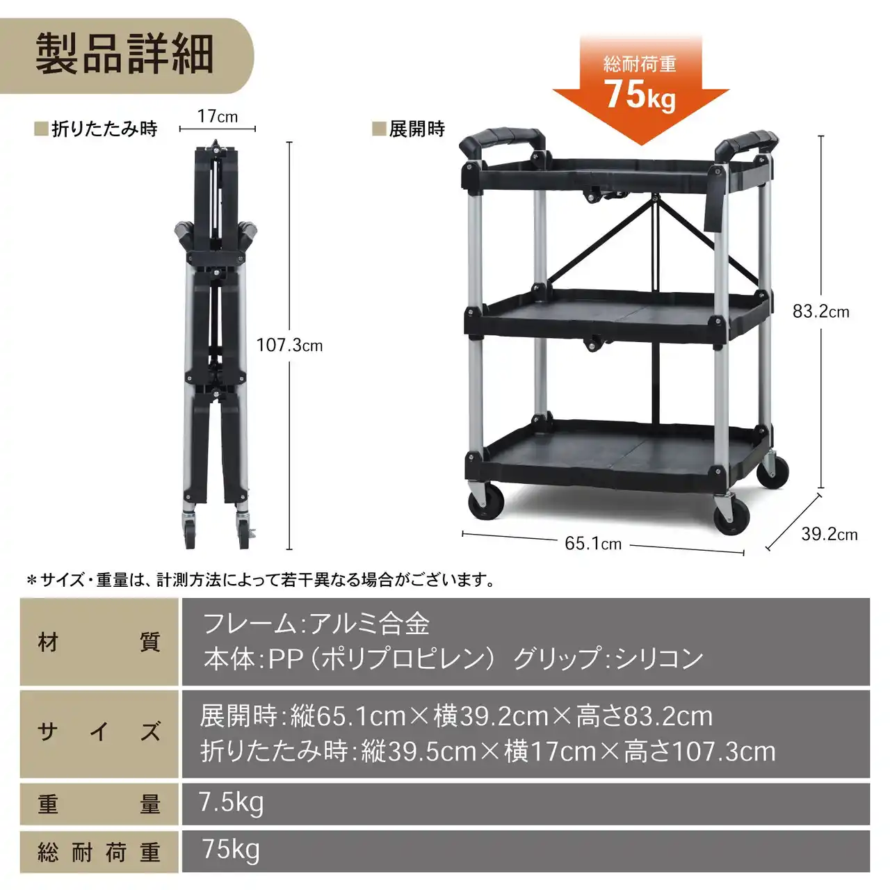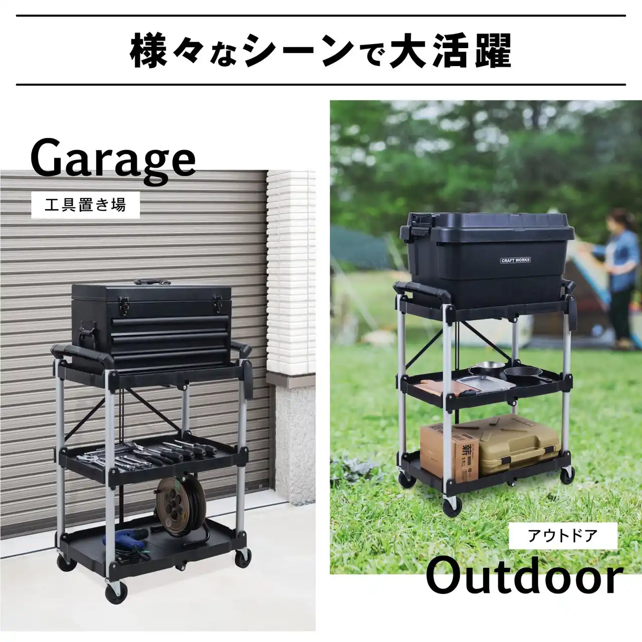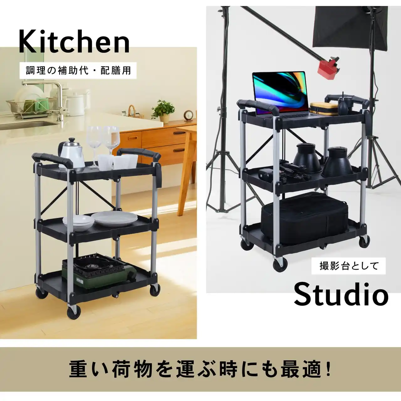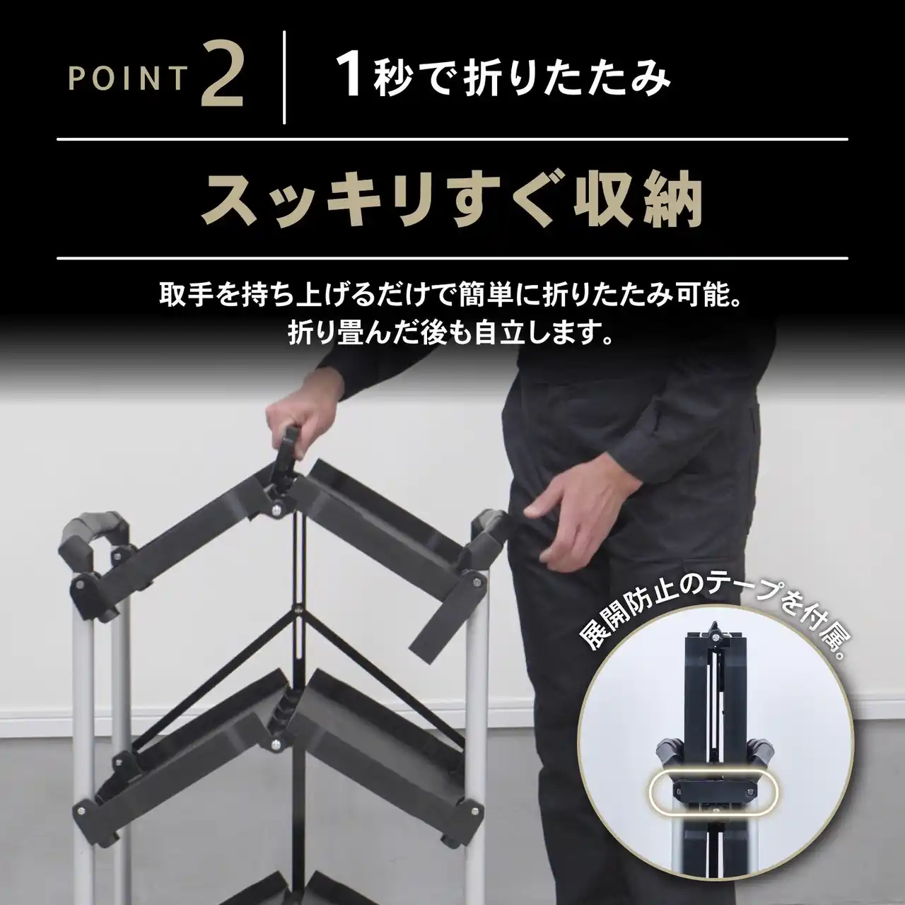 | 組み立て不要ですぐに使える。折りたたみ1秒、3段設計、耐荷重75kg。工具置き場、アウトドア、イベントの道具運搬、調理の補助台、配膳用、スタジオの撮影台に。現場に1台はほしい、作業の必需品。 |