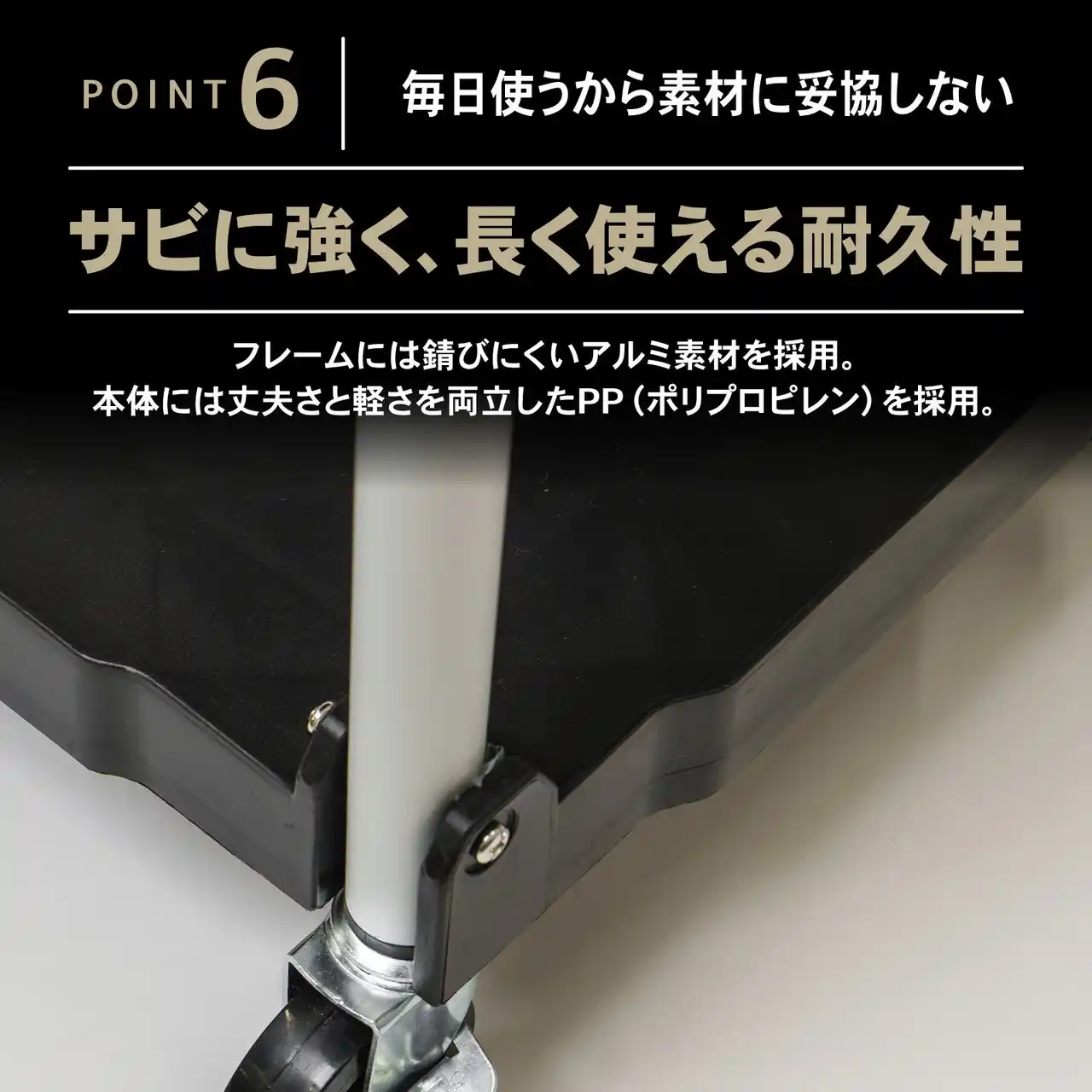 フレームには錆びにくいアルミ素材を採用。 本体には丈夫さと軽さを両立したPP(ポリプロピレン)を採用。 |