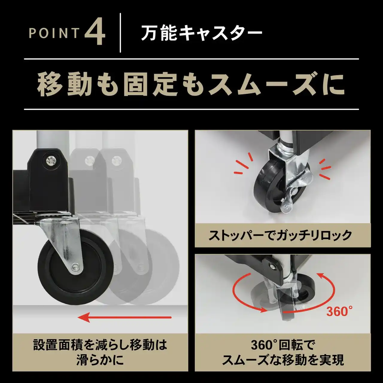 | 万能キャスターで、安定性とスムーズな移動を両立しています。 | ||||||||||||