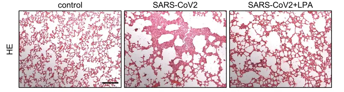 | シリアンハムスターを用いた感染実験では、LPA投与(10mg/kg、30mg/kg、腹腔内投与)により、肺組織の炎症スコアが有意に改善し、血管内皮細胞の剥離や血管構造の破壊が抑制されることを確認しました(図2)。 | |||